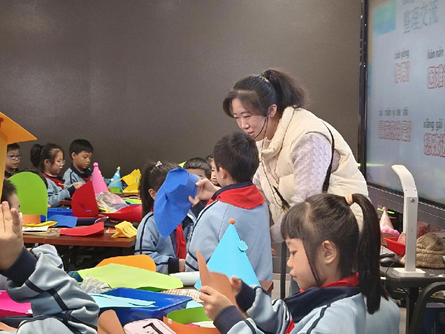 第二节,温州市蒲州育英小学的杨爱爱老师带来了《做一顶帽子》的课堂展示,杨老师设计了丰富的材料,引导学生们做一顶实用、戴的住的帽子,课堂现根据有的材料进行设计,然后根据自己的设计图进行实践制作,最后展示自己的作品,学生们充分体验到了工程设计的乐趣。