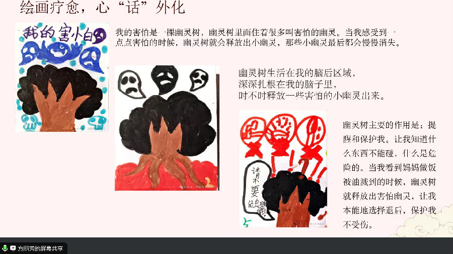 首先,由瑞安市玉海中心小学方丽芳老师带来讲座《校园中心理健康与美育融合的全人艺术教育实践》。方老师从绘画疗愈、校园心理健康与美育融合等方面进行分析。通过详尽的案例深度剖析了学生内心的情感特征,强调了美育在促进学生心理健康方面的积极作用。