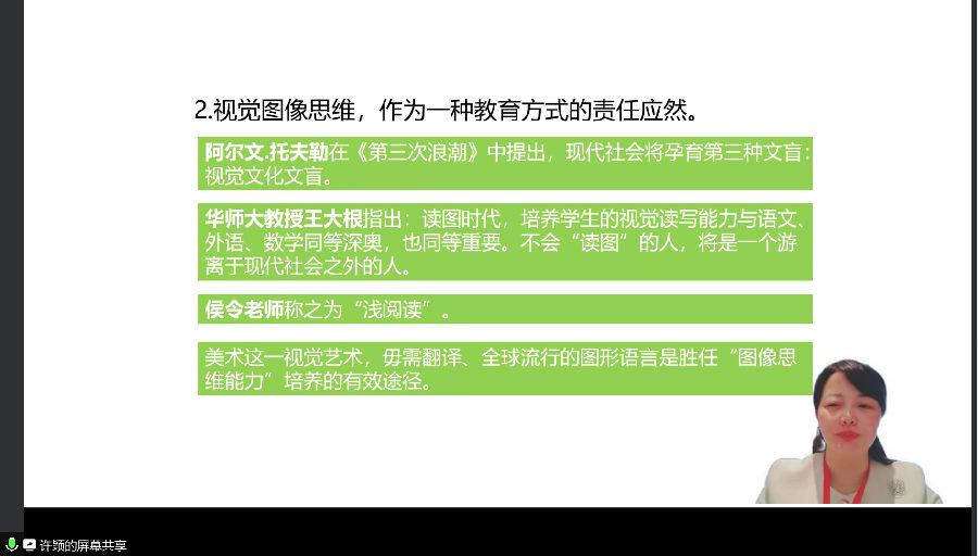 随后,正高级特级教师、鄞州区教研员许颖老师带来主题讲座《图像思维:三课一体化研究》。在讲座中,许特强调了“视觉图像思维”在教学中的重要性,认为其教学场域应当是充满活力且真实的课堂环境。许特还提出了“四式三步”这一创新策略,深入探讨了美术教学的课堂构建,并通过丰富的案例深入剖析了视觉图像思维的教学策略体系。本次讲座内容丰富且视角宽广,为学员们带来了很大的启发。