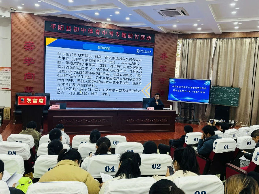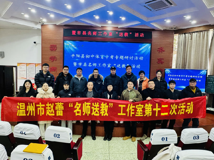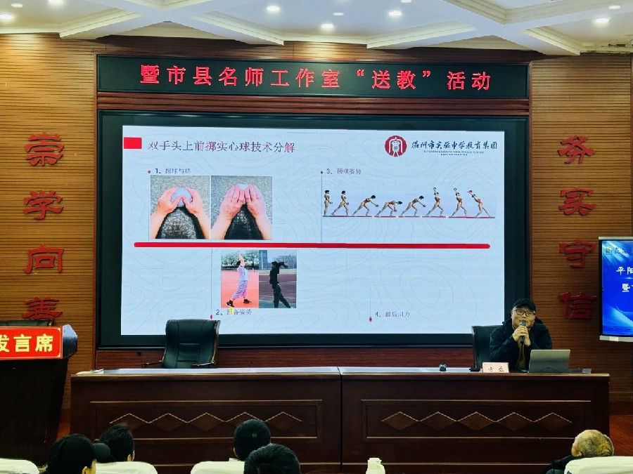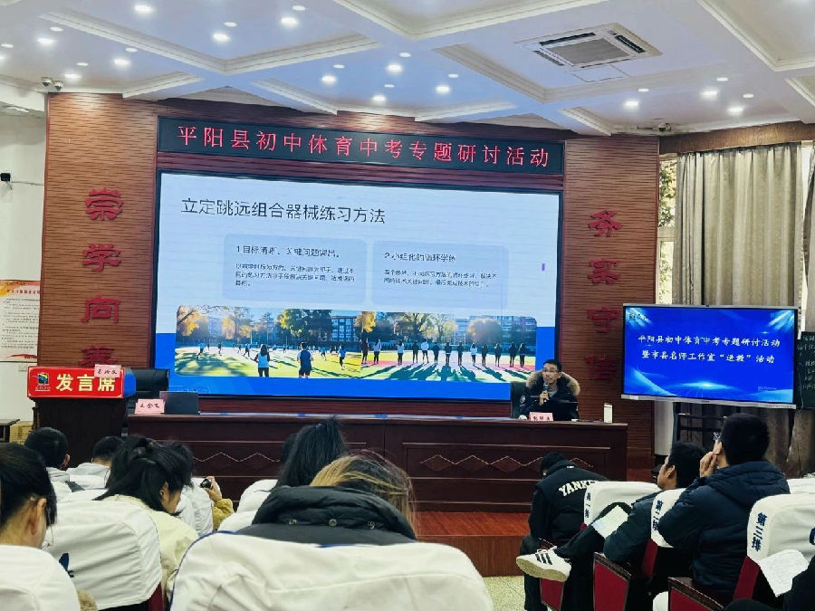 平阳县体育教研员王青迪老师、温州市赵蕾“名师送教”工作室成员、鹿城区赵蕾名师工作室成员、平阳县何雷名师工作室成员、平阳县林成要名师工作室成员、平阳县各初中体育教研组长以及新入职中小学体育与健康教师等齐聚一堂,通过教学展示、专题发言和专题讲座等多元形式,共同探索“体育中考教学”的有效路径。