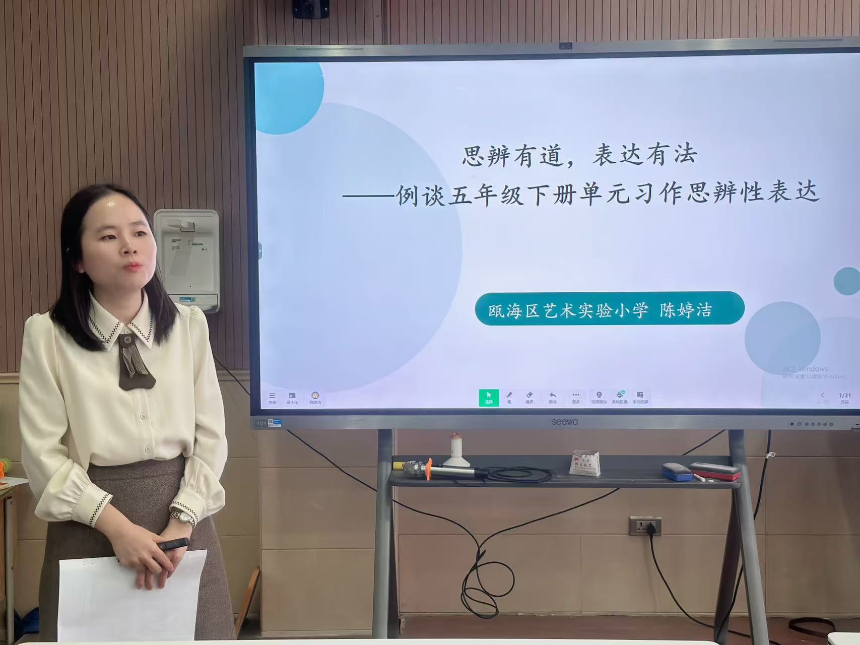 紧接着,由瓯海区艺术实验小学的陈婷洁老师带来经验分享《思辨有道,表达有法——例谈五年级下册单元习作思辨性表达》。新课标将“思维能力”作为核心素养的重要内容之一,陈老师以部编版五年级几个习作教学为例,从三个方面提出自己习作教学心得:明确思辨性表达的关键点,探索思辨性表达的切入点,捕捉思辨性表达的闪光点。在日常习作教学中,教师可以通过观察发现、微课突破、类比迁移、例文引路和嵌入评价的方式设计习作学习路径。
