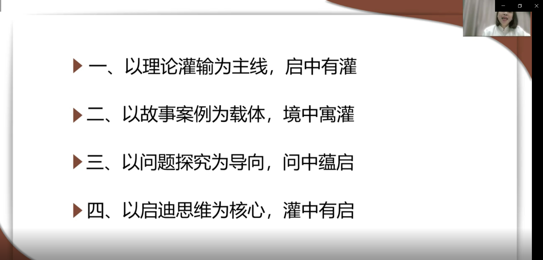 王老师进一步针对教材课例提出了实施的四条策略:1.以理论灌输为主线,启中有灌。2.以故事案例为载体,境中寓灌。3.以问题探究为向导,问中蕴启。4.以启迪思维为核心,灌中有启。