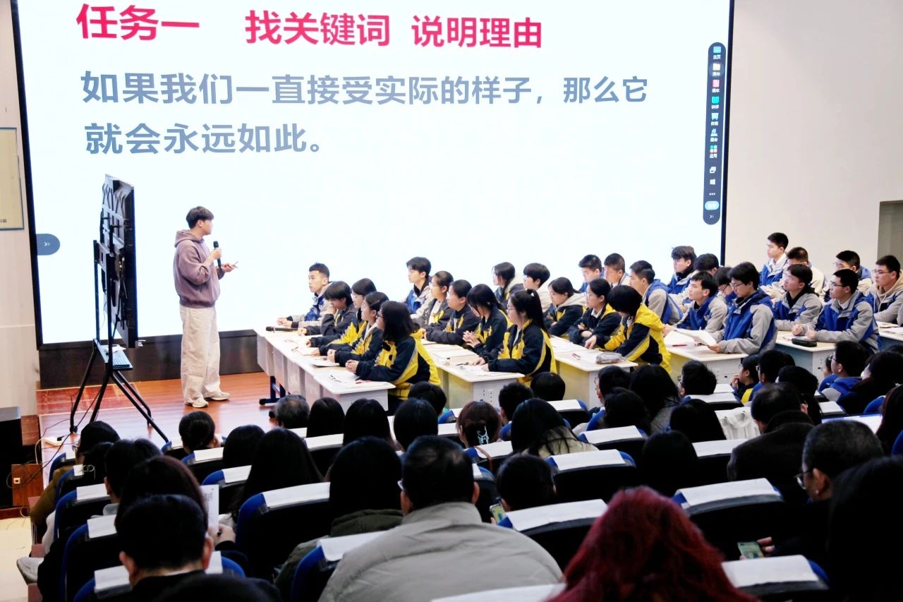 活动以两节公开课拉开帷幕。温州翔宇中学谭海舟老师带来《引语式材料作文审题专训》,通过从关键词到思辨点的典型例题剖析,引导学生掌握审题立意的技巧与方法;周康平名师工作室的卢蕾蕾老师则以《如何做好信息类阅读题》为主题,结合二模试题特点,系统讲解信息筛选、逻辑推理的解题策略。两位教师凭借丰富的教学经验,将理论与实践紧密结合,为在场教师提供了可借鉴的教学范式。