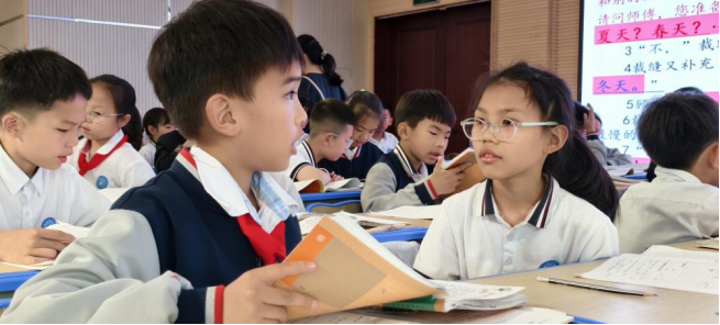 蔡心茹老师与三(1)班学生共同呈现《慢性子裁缝和急性子顾客》课例。她以学生的生活体验为切入点,让孩子们结合实例聊一聊自己的性格特点。后引导学生通过前测表格对比对课文进行框架梳理并作简单复述。在分角色朗读环节,一急一慢的人物性格反差在学生们的演绎中得以体现。课堂中,蔡老师特别设计“复述故事微舞台”,引导学生对“有趣的第一天”展开生动复述。