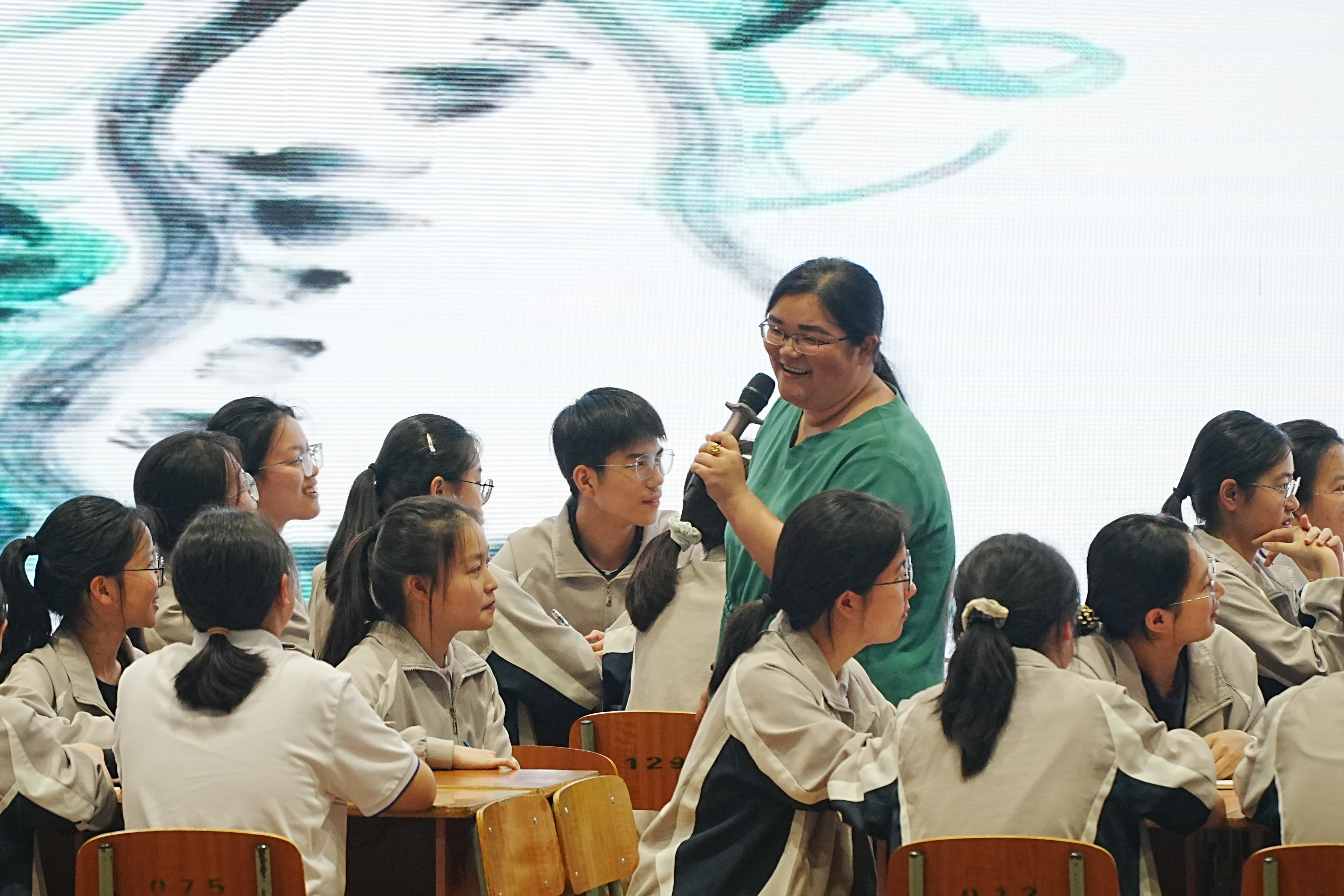 第二堂课是郑萍老师带来的《聚焦作文的理性思维》。郑老师从葫芦图的猜字和说字出发,《五石之瓠》深化拓展多元立意,提出“新”陈言务去——“实”立足当下——“我”主动成长的立意路径,从立意到立人,实现语文学科的育人价值践行。