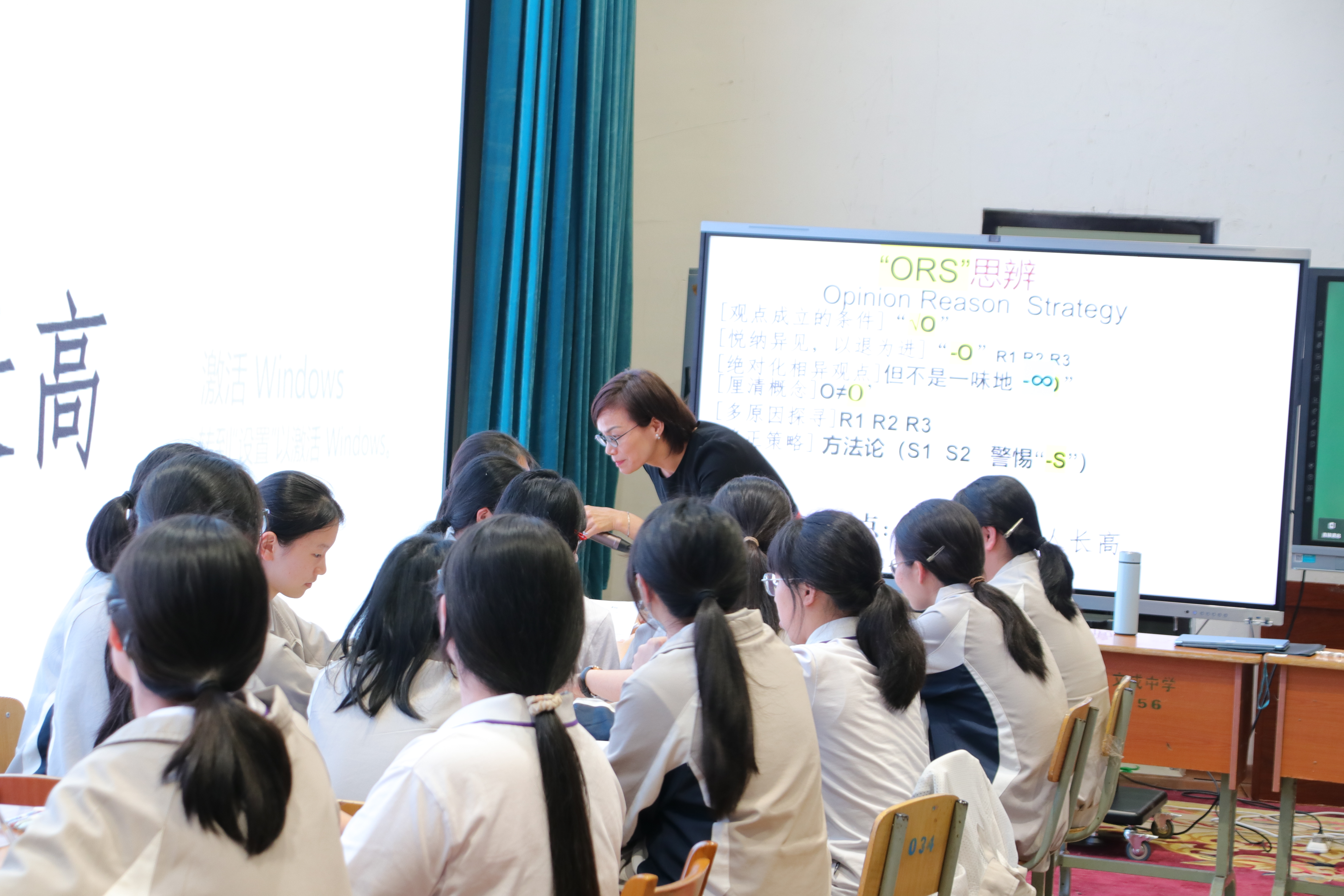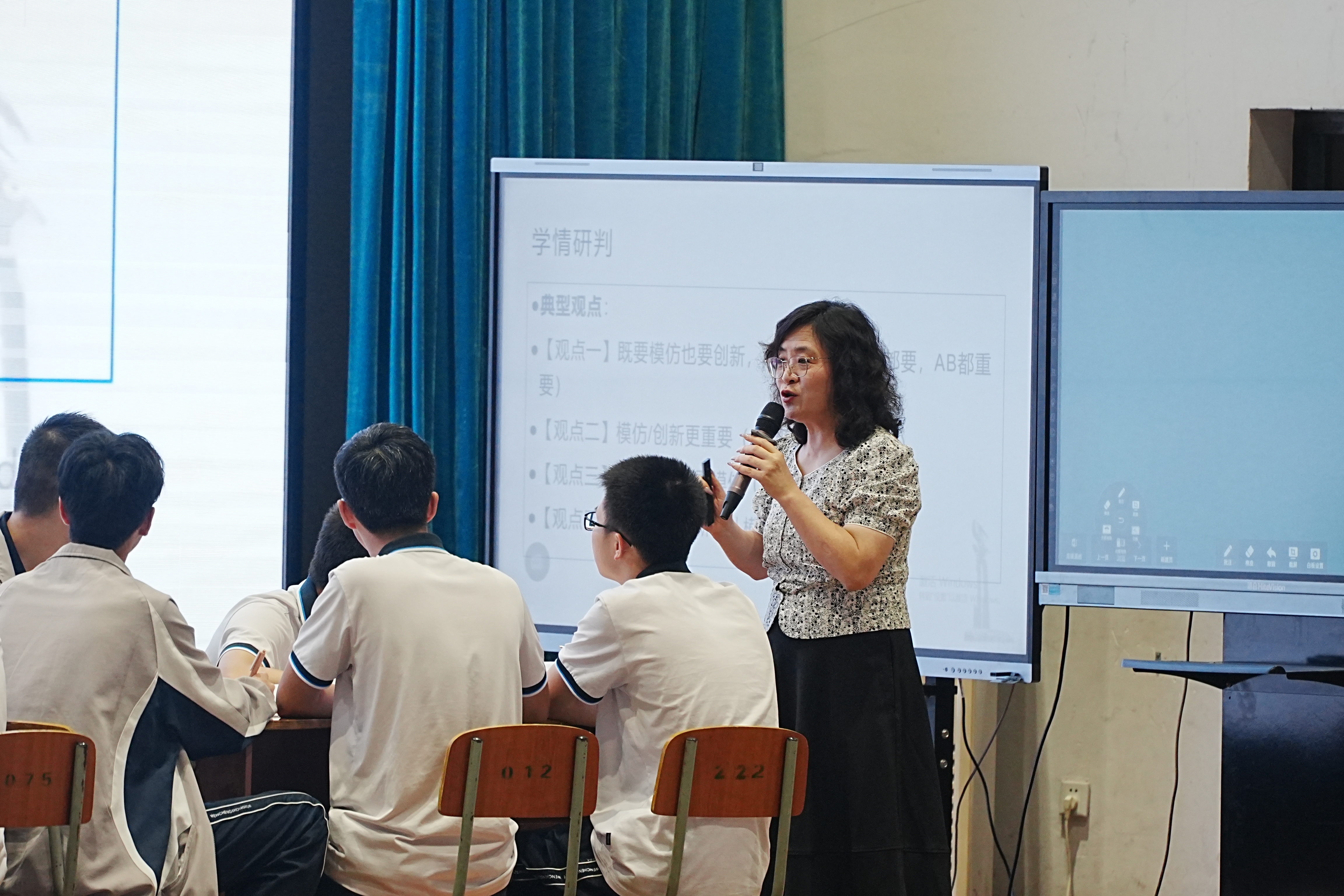第三堂课是蔡瑞琛老师的《核心概念的“拆”和“释”》。蔡老师以“对文化传承中‘模仿与创新’关系的思考”引出学生的典型观点,给出观点评价量表对学生典型观点进行研判,再以病例问诊开出“药方”和四象限图拆解关系,达到对模仿和创新的新的阐释。蔡老师还为学生提供了拆词和对象拆解的诠释方法,以多种切实可行的方法突破学生阐释说理的痛点和难点,实现有效立论。