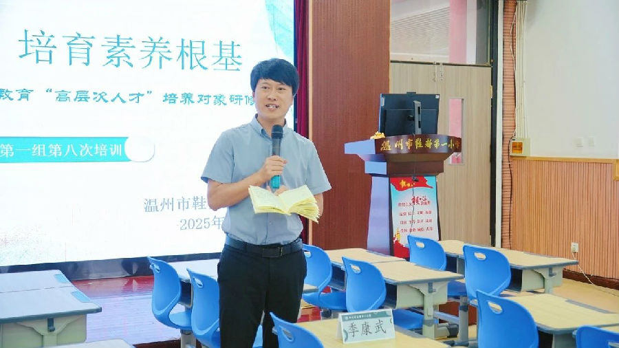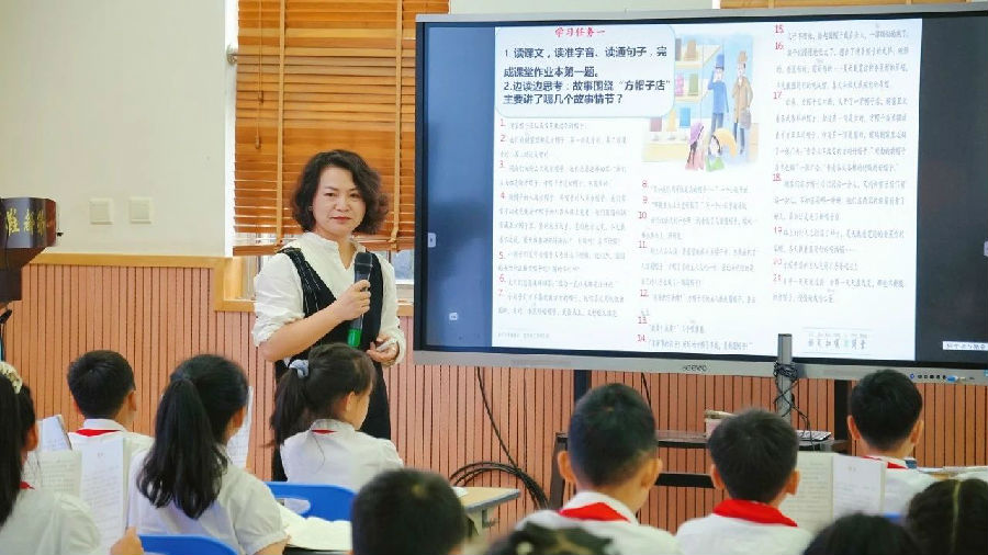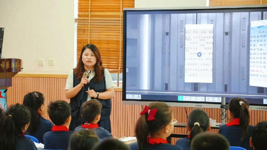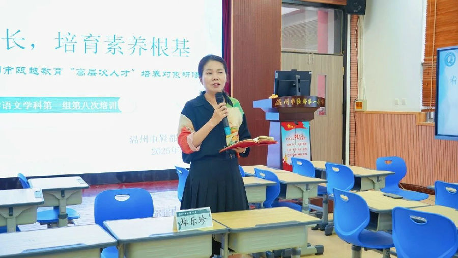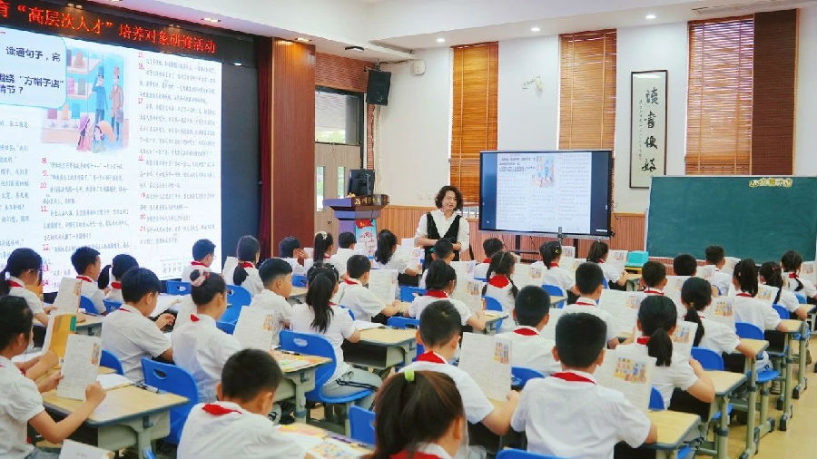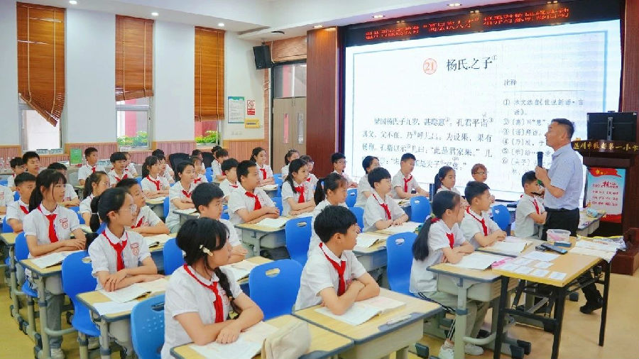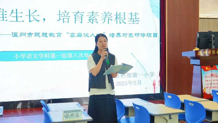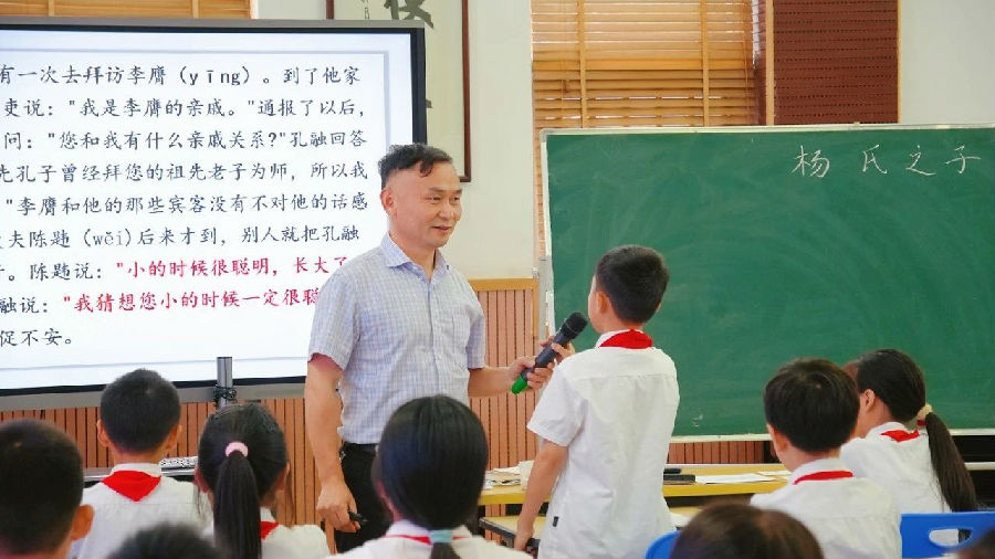 下午的研修活动同样精彩纷呈。泰顺县魁镇中心小学正高级教师林上好老师携手五(2)班学生,带来文言文课例《杨氏之子》。林老师创新运用“四阶朗读法”开展文言文教学,从引导学生预习课文、纠正字音,到深入理解内容、体会语言韵味,再到通过反复诵读实现自然成诵,每一个环节都精心设计、扎实推进,充分展现了文言文教学的深厚底蕴与灵动魅力,让学生在朗朗书声中感受中华传统文化的博大精深。