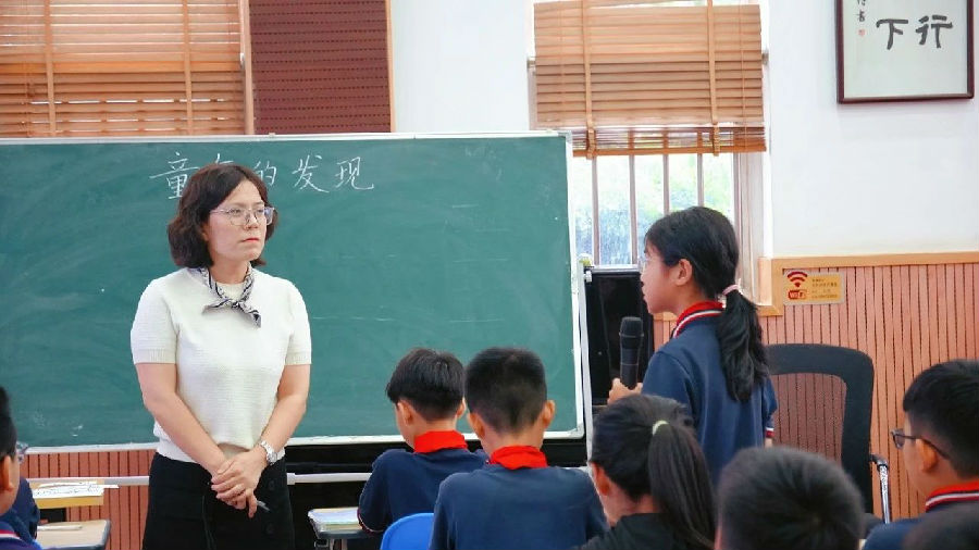 乐清市丹霞路小学正高级教师王琼赛老师以充满梦幻色彩的“梦境”导入,与五(4)班学生共同演绎《童年的发现》一课。王老师巧妙借助思维导图这一高效工具,犹如为学生配备了一张精准的导航图,带领他们在课文的迷宫中自由穿梭,梳理出“发现—探究—结果”的清晰思维路径。在小组合作学习中,学生们尽情感受语言的独特趣味与探索发现的无限乐趣,课堂氛围活跃而热烈。