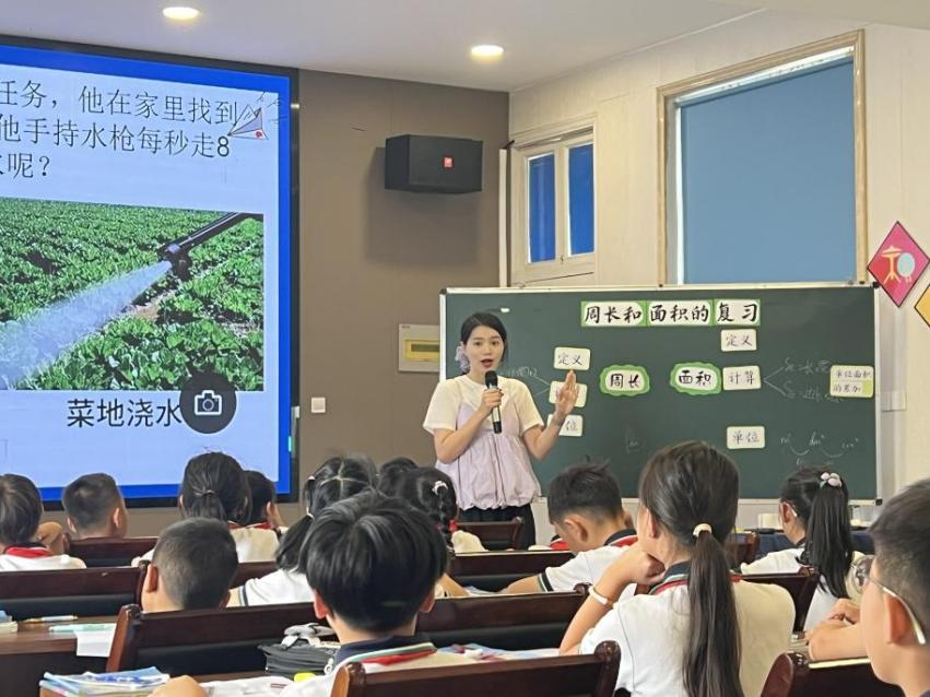 活动伊始,由瑞安市桐浦镇中心小学黄文瑞老师与三(1)班的孩子们带来课例《周长和面积的复习与整理》。黄老师课前组织学生绘制思维导图,课堂上巧设问题,让学生在具体情境中串联知识,通过任务驱动的教学方法开展项目化学习,促进生生互动,关联单元知识内容,梳理周长与面积的定义、单位、计算等知识。最后以“问题链”引导学生想象并作图分析,在对比中有层次地呈现课堂作品,带领学生从“浅层记忆”走向“深度辨析”。整堂课由浅入深,在迁移中应用,既夯实基础知识,又发展空间观念。