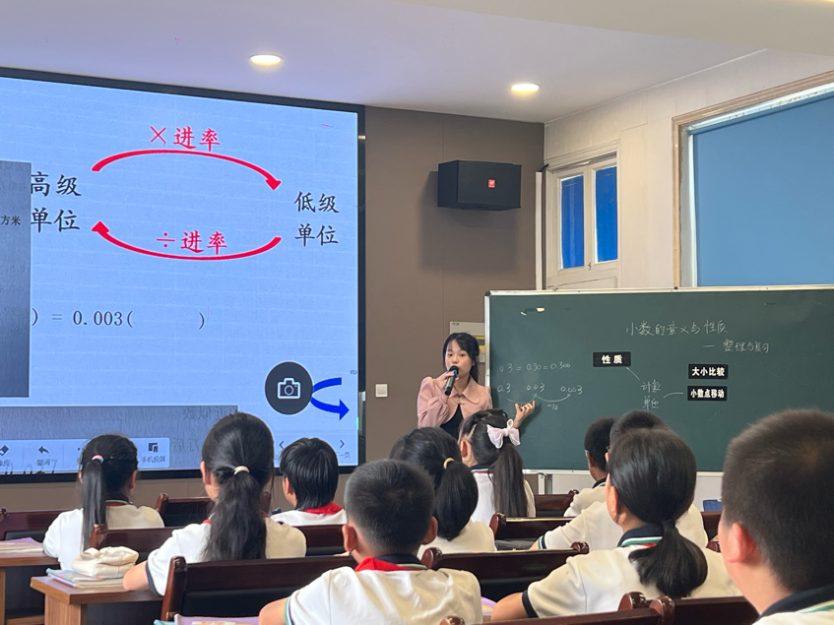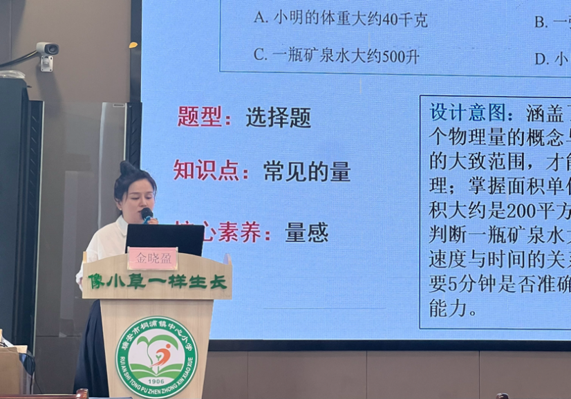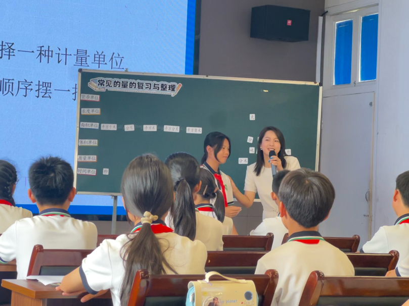 随后,瑞安市莘塍东新学校的杨如如老师带来课例《常见的量的复习与整理》。杨老师先以常见计量单位的“分类与整理”展开,通过对比、分类、小组汇报和讨论,帮助学生梳理已学过的六大类计量单位(长度、面积、体积、时间、货币、质量),并深入探讨不同单位间的进率关系和实际应用,从而组织学生重点分析最易混淆量的进率关系。学生在辨析、解决长度、面积、体积等计量单位的生活实际问题中,加深对计量单位的理解,发展学生的量感和应用意识。