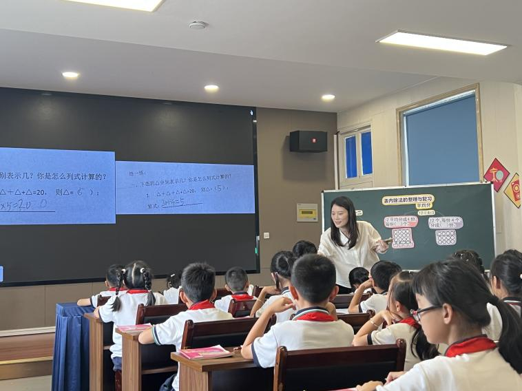 首先,瑞安市教育发展研究院附属小学的叶君君老师带来课例《表内除法的整理与复习》。叶老师通过“三四得几”这个口诀导入,沟通乘除法的关系,并结合前测单呈现除法的两种内涵,即:等分除和包含除,引导学生用数形结合的形式分析这两类除法模型,突破除法学习的难点。随后,叶老师用“22÷5=4……2”引出有余数的除法,在对比辨析4个生活实例中,感悟除法和减法的区别,以及去尾法和进一法,帮助学生打通除法的整体脉络。