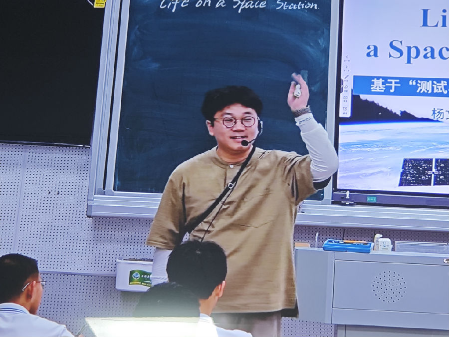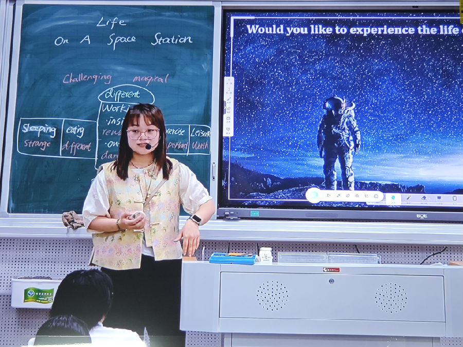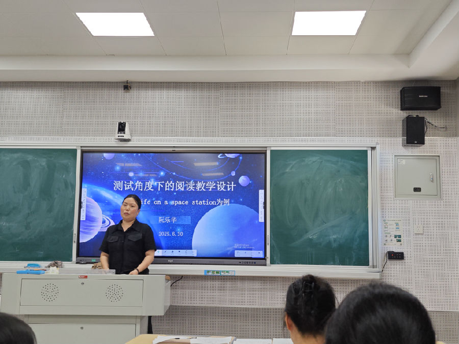 上午的议程以两节公开课开始,课题是单元辅助教学语料Life on a space station,全文670词,为总分结构,第一段为introduction,第二段至第七段详尽描述了太空生活的方方面面—sleeping, work, eating,exercise以及leisure activity。来自大荆中学的薛文文老师以视频导入太空话题,和学生共聊太空点滴。阅读活动从阅读第一段获知太空生活评价到预测后续文本阅读到自主阅读核对到第二段至第七段的主旨大意概括到第二段与第三段薛老师引导学生比较太空生活和感受到学生自主比较概括第四段到第七段的太空生活和感受。读后活动在观看一个从太空观看地球的视频基础上学生两人一组讨论宇航员应具的品质。整堂课教学自然流畅,重点突出,师生互动活跃,学生的语言和内容输出很有质量。第二节课是来自虹桥实验中学的杨文斌老师。杨老师充满激情,教学从视频导入到根据标题预测文本内容到核对预测内容到段落内容梳理(含challenges, solutions, qualities),出口任务是学生分享太空生活以及还想要咨询宇航员太空生活的什么内容,很好地将文本内容和未知内容结合在一起。杨老师课堂教学的亮点在于将他从测试角度设计的5道题自然地融入课堂教学任务的设计中。