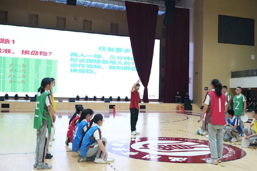 在教学展示环节,第一节课是温州实验中学李子豪老师带来的极限飞盘《正反手掷盘的练习方法2:摆脱跑位+正反手掷接盘》,李老师以“正反手掷接盘练习方法”构建课堂,从单一的不同距离的原地正反手掷接盘身体练习;到折返跑+正反手掷盘,和摆脱跑位掷接配合+掷准比赛的组合练习;以及极限飞盘6V6比赛;让学生在比赛情景下进行练习,掌握技能,学会技术的迁移。