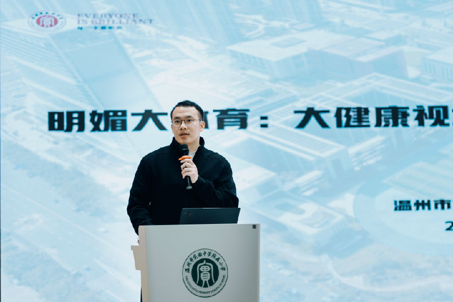 下午的经验交流环节,先是温州市实验中学陈鹏程老师以《明媚大体育:大健康视域下学校体育新样态的思考》为题,介绍了实验中学学校体育开展的情况,分享了“让特长闪亮在每个学生的生命里”的实践经验。