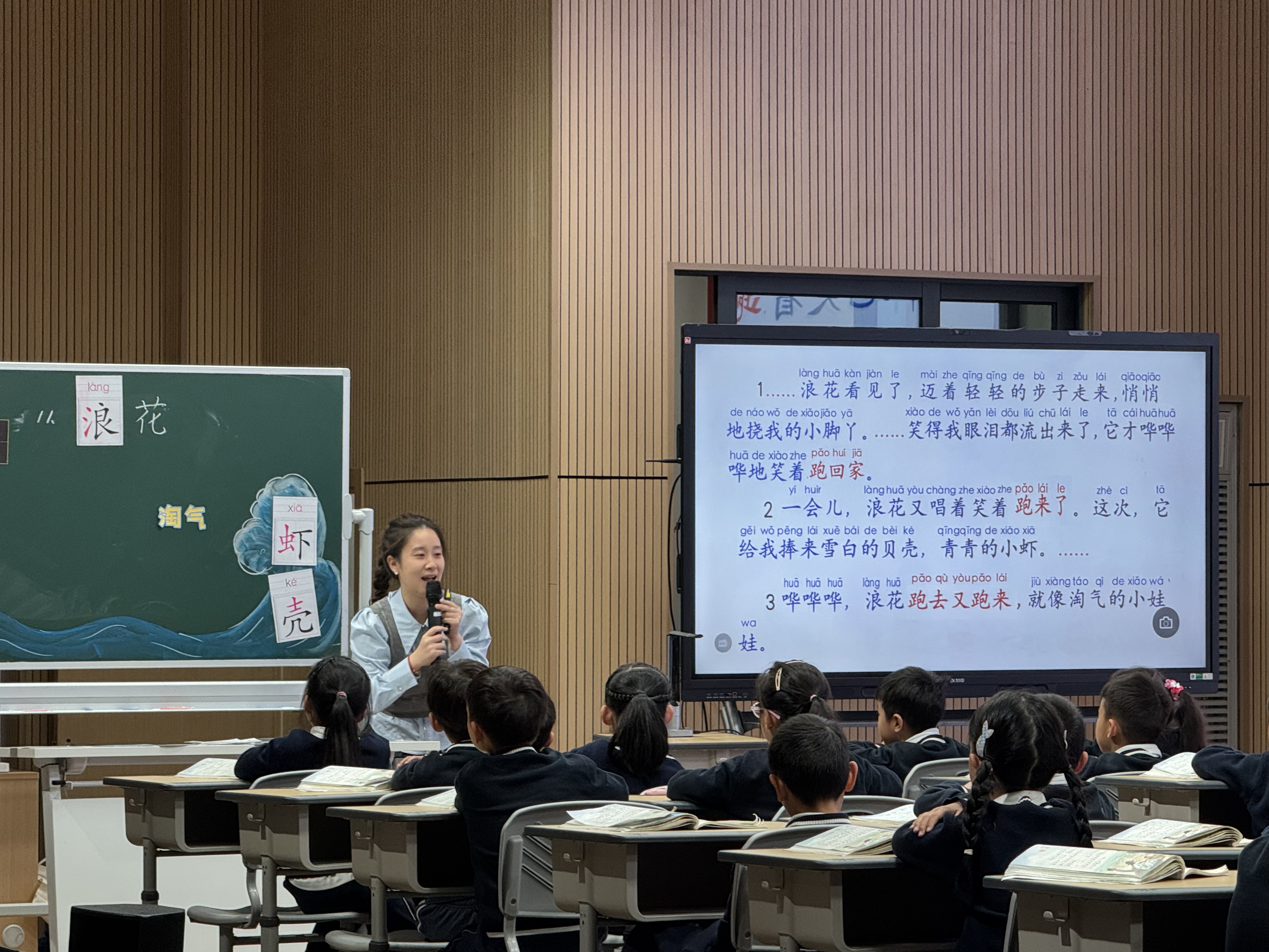 温州市广场路小学陈紫妍老师与一(25)班的孩子吹着海风走入童真童趣的《浪花》。陈老师精致的浪花板画紧紧抓住了孩子们的注意力,她轻快的教学风格让孩子们在与浪花、雪白的贝壳、青青的小虾和壳的拓展中完成随文识字。紧接着围绕寻找浪花淘气的句子开展朗读和理解,陈老师聚焦第一自然段中“悄悄地挠”“轻轻的步子”“哗哗哗地笑着”开展师生合作读、男女生合作读把丰富的表达收集到积累“漂流瓶”中。这节课童真童趣,陈老师融入课间操调控孩子们的学习状态,抓住学生主体,很好地落实了教学与学情的有机结合。