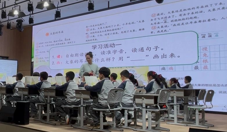下午第二节课,温州市籀园小学鲍磊鑫老师与温州市实验小学二(19)班同学共同呈现了一堂生动有趣的语文公开课《大象的耳朵》。鲍老师以扎实的教学功底和充满童趣的方式,巧妙运用“语调小箭头”和“重音小点点”两位“小助手”,将朗读技巧生动传授给学生,并将旧知识自然融入新课,引导学生融会贯通。学生们积极参与,沉浸于故事世界,享受学习乐趣。这堂趣味与智慧并存的课堂,必将激发学生对语文的热爱。