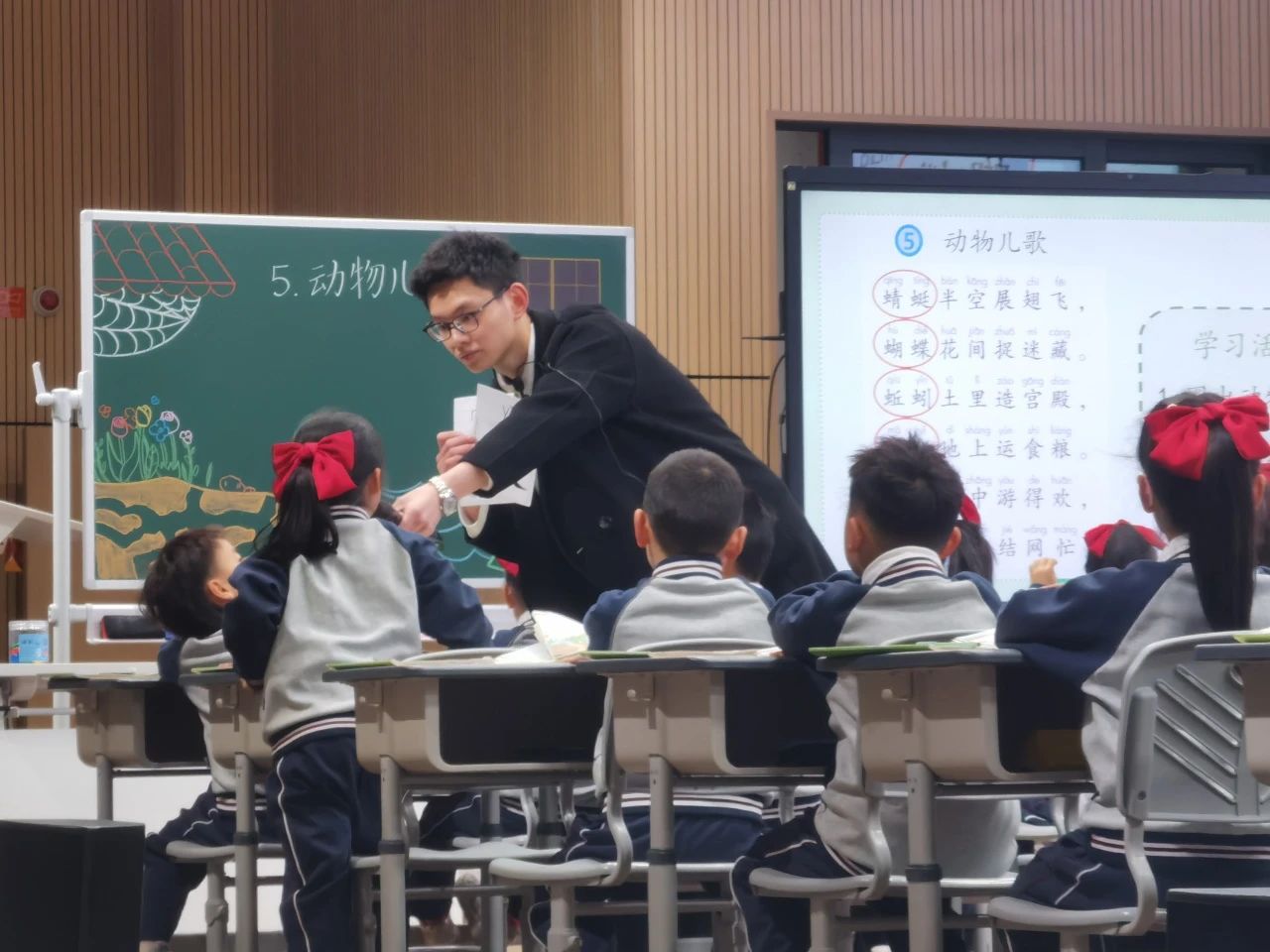 伴随着上课铃声,周柏奇老师带领一(26)班的孩子们到富有韵律的《动物儿歌》中一探形声字识字的乐趣。周老师牢牢抓住识字课文的教学目标,把形声识字与趣味结合,通过视频生动呈现了虫字旁的演变、运用形声字识字方法玩汉字碰碰碰、听音找字并让孩子有序整理字卡,多种方式运用了字理识字、形声字识字、加一加识字等识字方法。在周老师的课堂中,孩子们通过拍手读、节奏读、演读,让有趣的《动物儿歌》春雨般滴入孩子们心间。