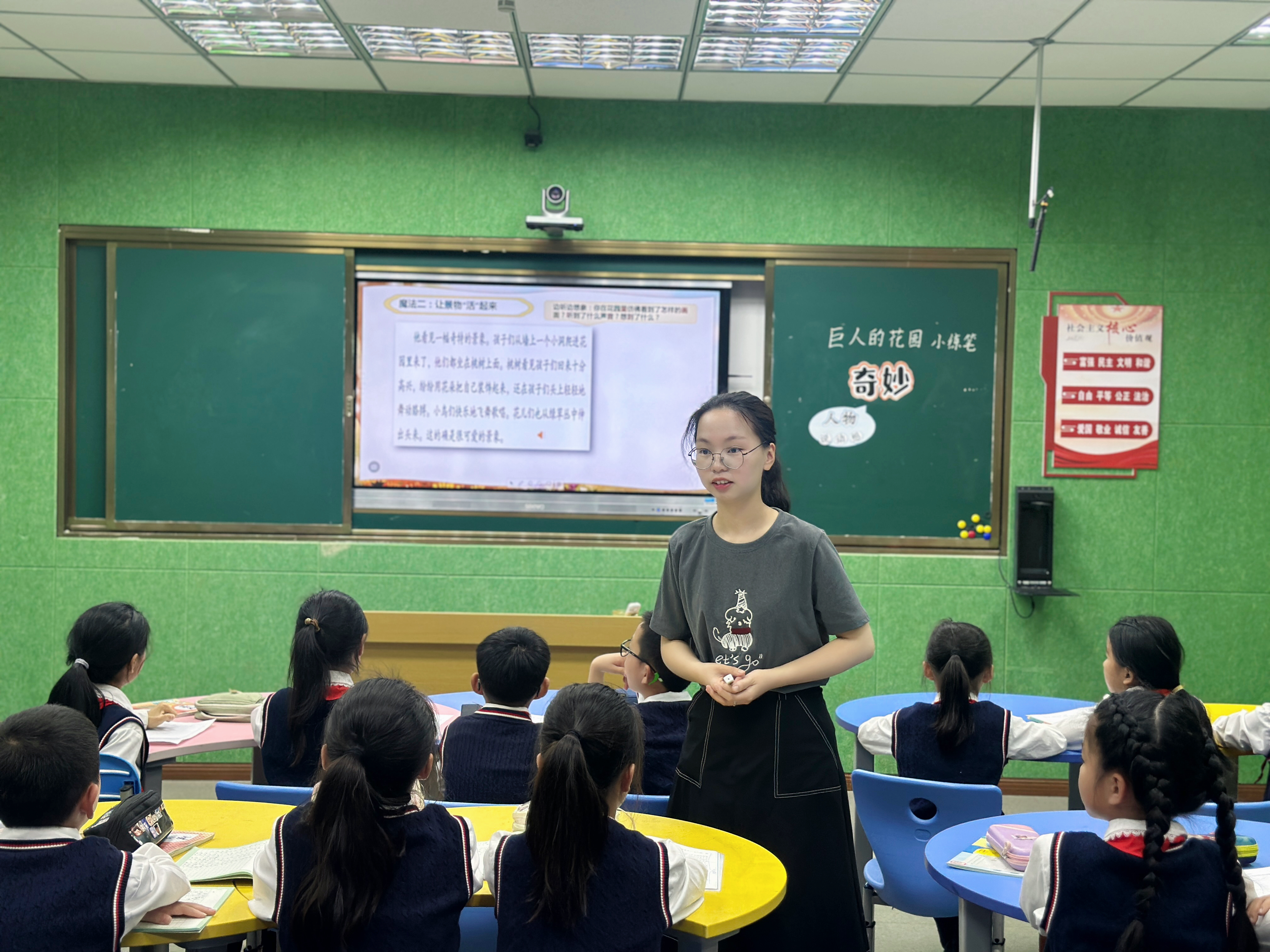 第三节课由陈婷洁老师执教《古诗三首》小练笔。陈老师引导学生通过表格梳理回顾古诗,发现其中蕴含的童趣。在写作指导环节,陈老师从初稿讲评入手,呈现典型短文,启发学生展开想象,添加动作、语言、神态等描写,将静态文字转化为连续画面。接着,重点指导学生借助“想象细节放大镜”修改短文,让童趣在文字中增值。