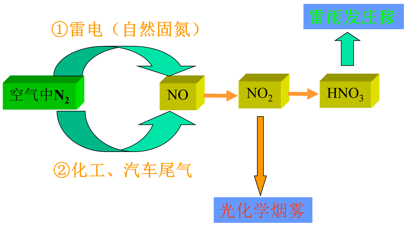(1) 氮氧化物的产生及转化,巴氮氧化物的转化与三种固氮(生物固氮、自然固氮和化学固氮)结合起来,教学线索如下: