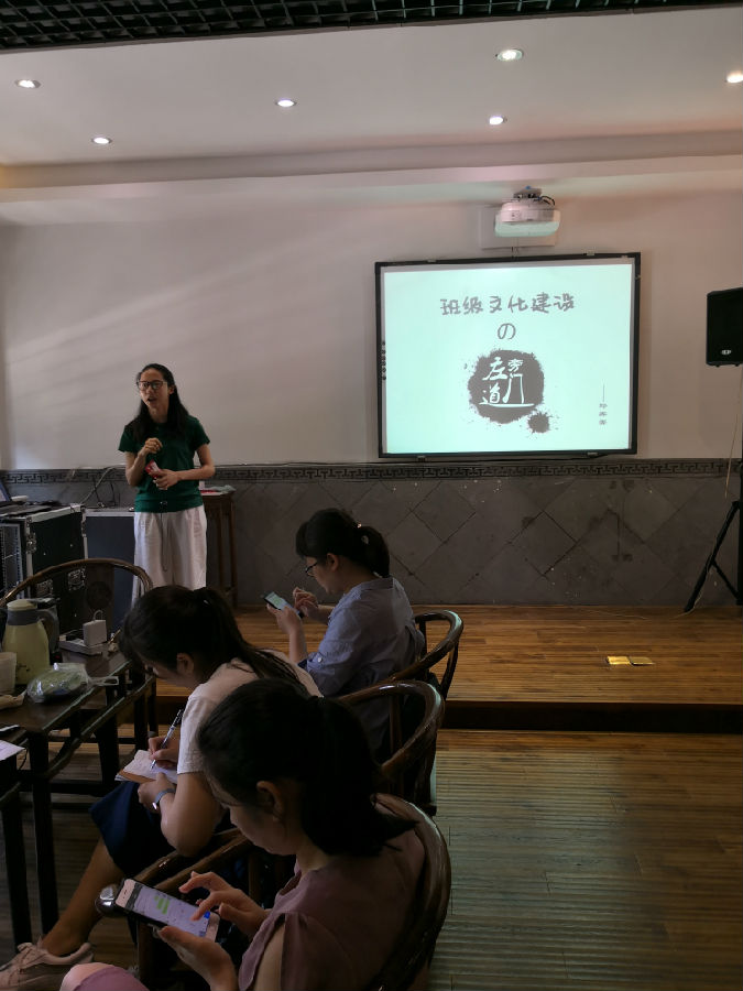 首先由来自温市十四中的郑佩芳老师分享,她从班级硬件文化建设和精神文化建设,具体详尽的介绍了班级文化部署及如何落实到孩子的行动上,最终如何转换成为班级向上的力量,让人感受到她的润心养才,合力向前的理念。