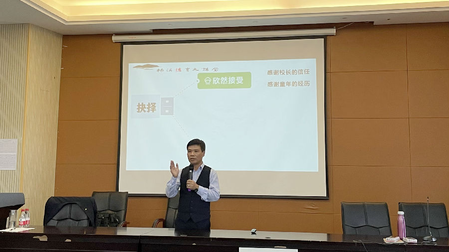 浙江省特级教师、正高级教师陈建仁做《唤醒沉睡的巨人》的专题讲座。陈老师说,每一个孩子都可以成为天才,只是自己不知道,老师的主要价值就是和家长、社会共同合作,来帮助孩子唤醒自我,而唤醒学生的前提是唤醒自己。