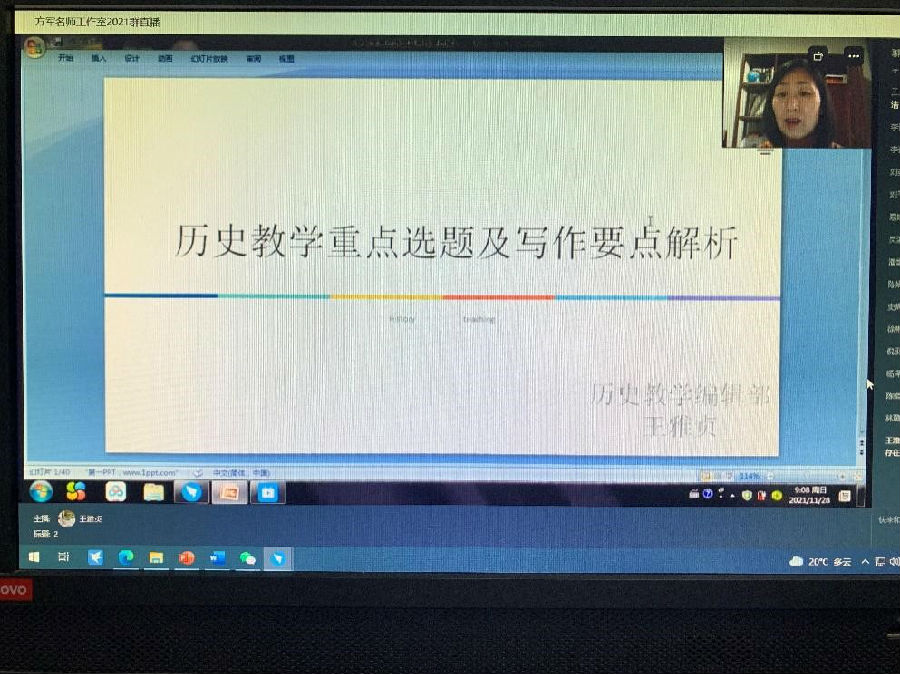 2021年11月28日温州市方军名师工作室第9次活动在线上展开,本次活动主要有两项内容,一是《历史教学》编辑部王雅贞主任做题为《历史教学重点选题及写作要点解析》的讲座,主要就《历史教学》杂志2022年的重点选题以及杂志编辑部在审稿过程中梳理的写作要点给学员们做深入细致地分享和指导;二是对学员们的论文做针对性的指导。