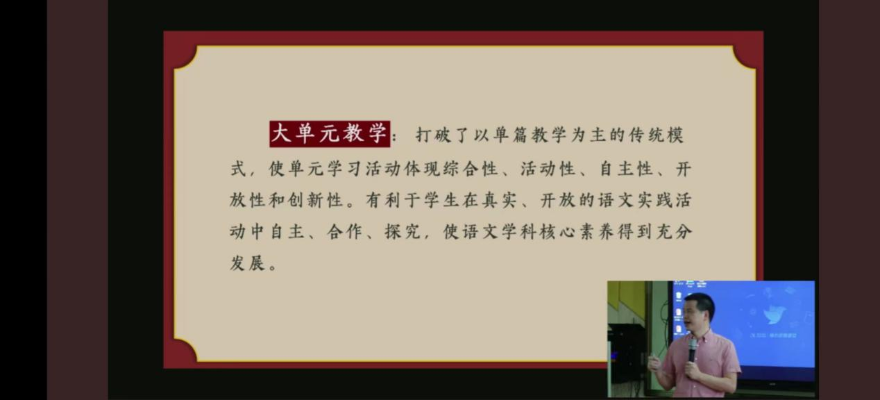 水本无华,相荡乃兴潋滟。石孰有火?互击而闪灵光。理论引领加上课堂实践,站在整个单元统领的角度,指向教学的靶心,关注语文要素、语文能力的发展,诠释大单元教学的本质,展现大单元教学的极佳范本,为老师们拨开迷雾,指明方向。最后,何必钻老师针对大单元教学提出四点建议:1.坚持课程设计和教学设计的统一。2.坚持内容设计和学习行为设计的统一。3.坚持教师带领和学生明确的统一。4.坚持教学设计和评价设计的统一。高山仰止,景行行止,通过本次培训,相信老师们都能调整教学样态,遵循新课标任务群理念,积极践行大单元教学,在专业成长的路上行稳致远。