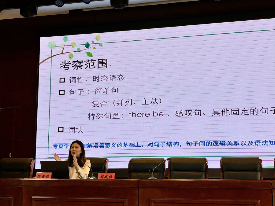 邹丽娟老师肯定了三位老师结合二模数据做出的分析和24天备考具体措施的可行性,同时也详细的点评了其中的不足。邹老师也结合自己带九年级在冲刺阶段的具体复习做法,作了《从学生视角谈中考复习策略》的专题讲座。邹老师分别从语言知识、阅读表达、阅读C篇、书面表达四个方面对中考如何根据学生学情出发,并强调根据《英语课程标准》和《初中学业水平考试复习导引》为依据,研究考点知识。邹老师提出在语法填空复习中落实引导学生心中有考点;眼中有结构(语境线索、句子结构);脑中有结构。讲座最后,邹老师强调最后24天,老师可以再做些:1.分析盲点(对照考点,分析学生失分点在哪里?观察学生的错误,访谈学生的思路)2.重点突破(分类突破:动词、句子结构……)3.给学生整理错题的机会(错误标记法)。