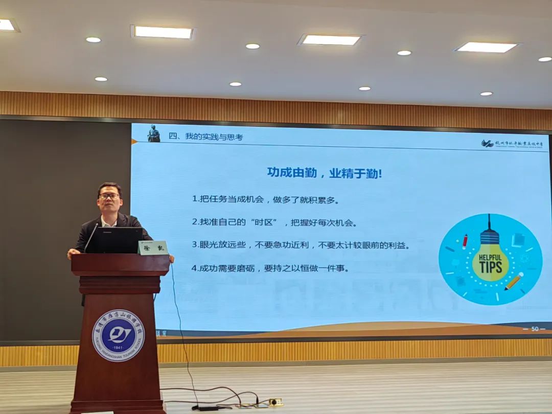 徐凯老师则从“专业建设的迭代之路”、“省高水平专业建设的做法”、“专业教师的成长路径”、“我的时间与思考”进行相关信息的分享,帮助我们更清楚地看到专业发展的方向,坚定了个人成长的脚步,让我们受益终生。