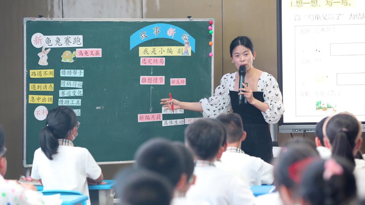第二堂课由洞头区鹿西小学教师陈小红执教四年级下册习作《故事新编》。陈老师抓住一个“新”字,打开学生的习作思路。在教学中,陈老师创设龟兔再赛的情境,先带领学生设想《龟兔赛跑》的比赛结果,即“龟赢、兔赢、双赢、双输”四种结局。为了让结局和情节的关系更加清晰和可视化,陈老师采用思维导图引导学生根据结局倒推:出现这样的结局是因为有怎样的故事情节?并从兔子和乌龟的性格、习性等特点出发,展开想象去大胆构建新的情节。在这个过程中,学生思维活跃,表达有理有据,尤其是在创新情节上脑洞大开,将乌龟和兔子赋予了新的特点,并置身于新的环境之中,故事情节也随之丰富而有趣。