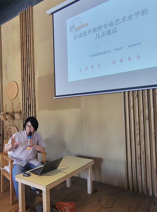 平阳县美协主席、教师发展中心叶志杰老师与大家分享了《谈谈提升教师专业艺术水平的几点建议》,他从中西方绘画的差异进行导入,从文艺复兴三杰到近现代油画,充分展现西方绘画的具象美;再通过赏析中国画感受中国画“诗中有画,画中有诗”、“论画以形似见与儿童邻”的意象美。在对比与欣赏的过程中,让学员感悟西方技术的极致与东方情感的表达。
