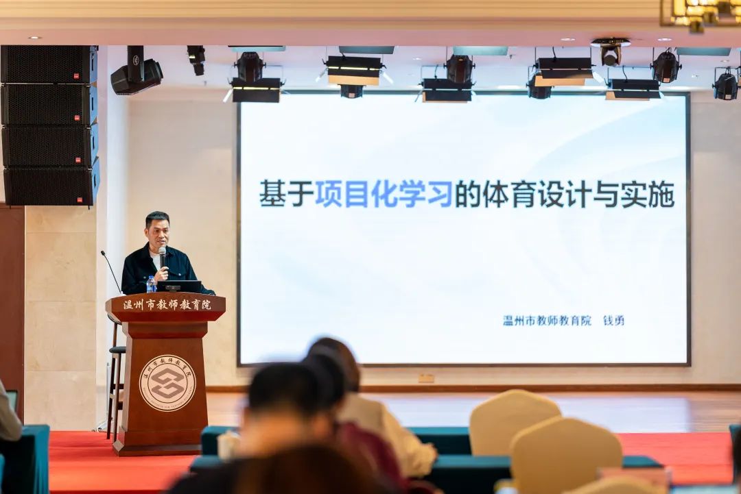 在此环节,钱勇老师作了《基于项目化学习的体育教学设计与实施》主题分享,他阐述了项目化学习内涵特征和新课程理念之间的关系,指出体育教学融入项目化学习,可以助推新课程理念落地,并提出了基于项目化学习的体育教学设计与实施的目标素养化、内容结构化、方法问题化、组织小组化、评价全程化的教学建议。