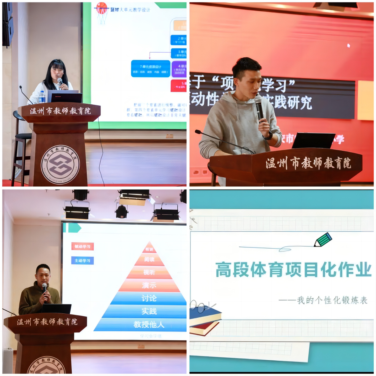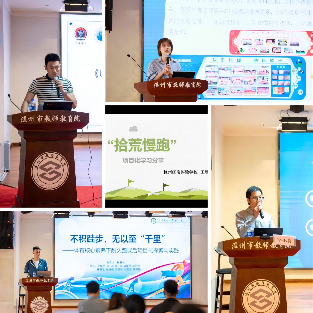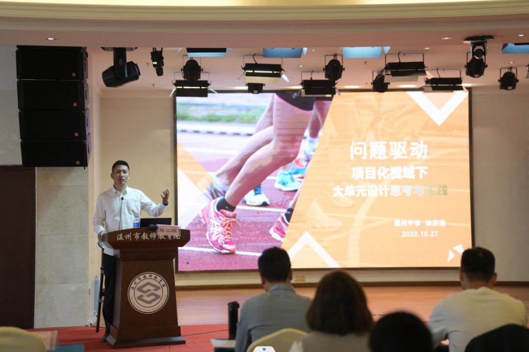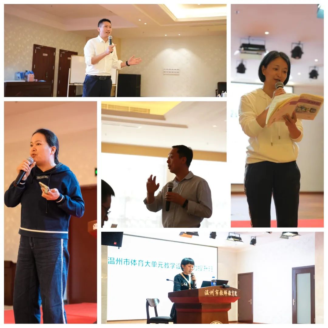 永嘉县瓯北第二小学邵呵呵老师结合自己的篮球课堂实践分享了“项目化学习”在小学篮球教学中设计与实施;瑞安市安阳实验小学宋肖杰老师从“跳绳”项目出发,结合理论分享了基于“项目化学习”驱动性问题的实践研究;杭州江南实验学校孙海鹏老师从本校“足球”项目出发,浅谈了基于“项目化学习”的足球教学实践探索;同样来自杭州江南实验学校的陈慧丽老师从高中学段出发,谈到高段体育项目化作业——学生个性化锻炼表的探究。