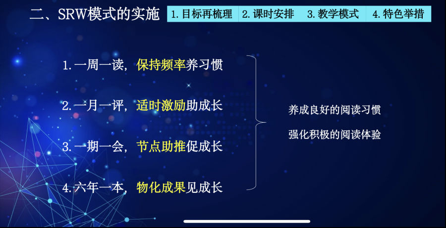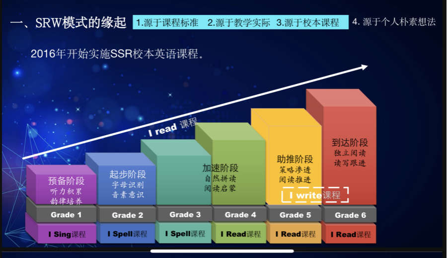 首先由周玉琴老师为大家带来讲座 《SRW模式下的英语阅读进阶之路》。 SRW意指sing,spelling,reading和writing。周老师从课程标准、教学实际、校本课程和个人想法四方面阐述了SRW模式的缘起,继而又从目标在梳理、课时安排、教学模式和特色举措这几等方面详细分享了她在班级如何开展英语阅读校本课程教学。周老师通过清晰的教学规划,有梯度的活动设计以及丰富多彩的评价机制,为我们展现了SRW模式的可实施性及其优越性。周老师展示的众多学生的优秀成果,使我们看到了在老师的用心引领下,学生所能达到的令人惊叹的高度。