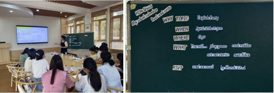 随后,工作室学员郑悠然老师进行PEP6 Unit3 My School Calendar B Read and write 的微课展示。郑老师以问题引领的方式引导学生抓取关键信息why,when, where, what等,梳理出邀请函的文本框架和要点。郑老师也充分利用了课堂作业本资源进行拓展学习。