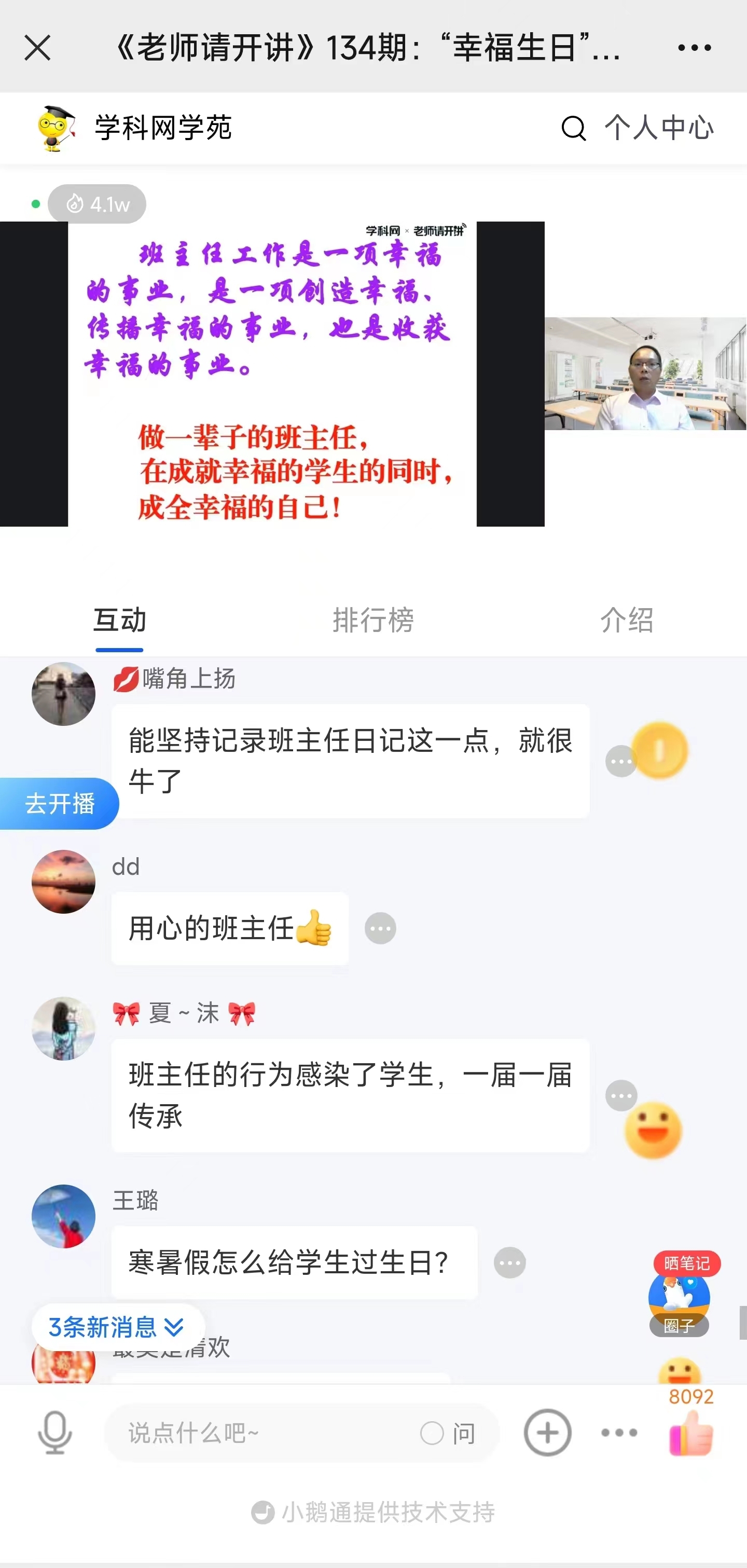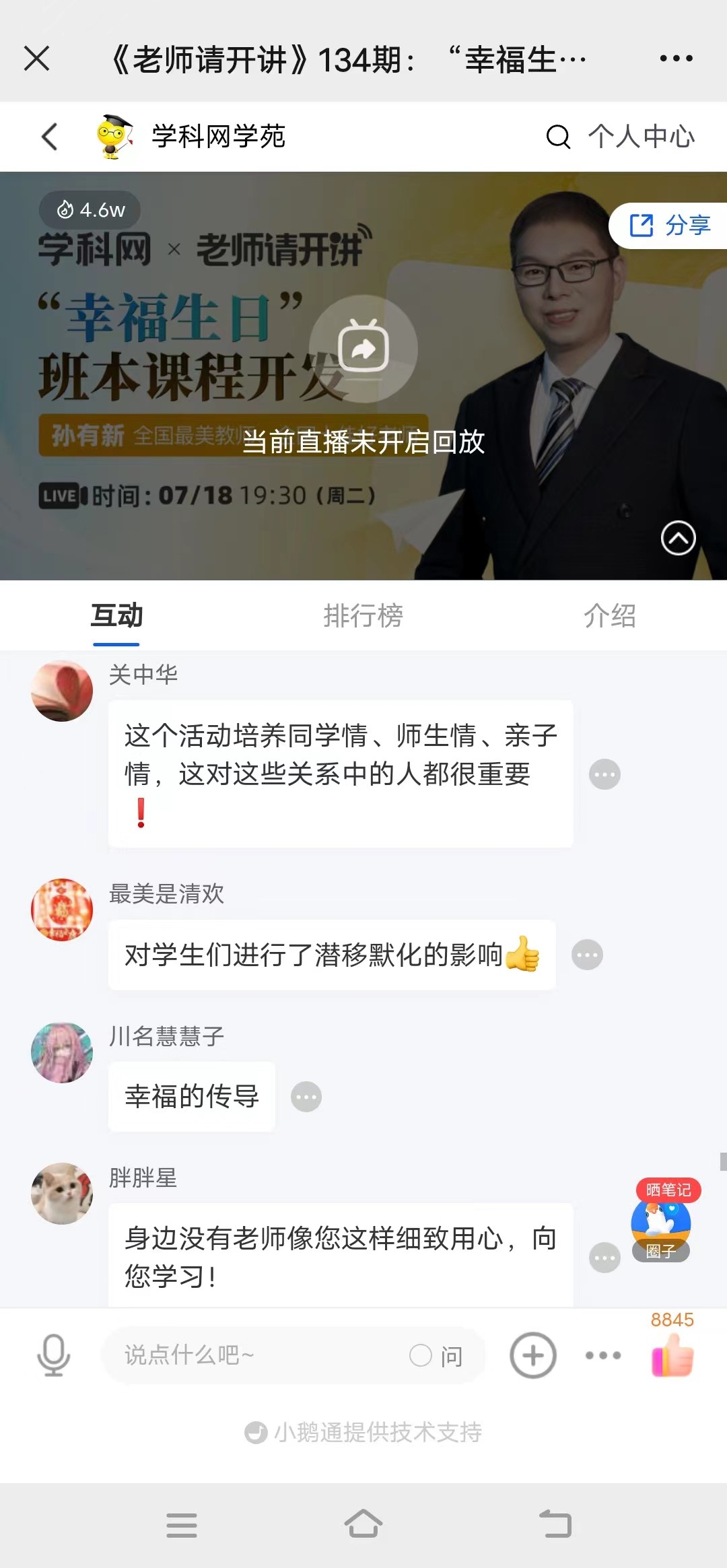 当晚,孙老师的讲座流量达到4.6W+,好评如潮:“孙老师,一位暖心幸福的班主任”“孙老师是有情怀的老师”“身边没有老师像您这样细致用心。向您学习!”“这个活动培养同学情、师生情、亲子情,这对这些关系中的人都很重要。”“对学生们进行了潜移默化的影响”“坚持的力量,伟大的创意”“班主任的行为感染了学生,一届一届传承”“孙老师于细微之处见伟大”……讲座后,还有很多全国各地的老师纷纷加孙老师的微信,向孙老师表达敬意,并表示要继续向孙老师学习。