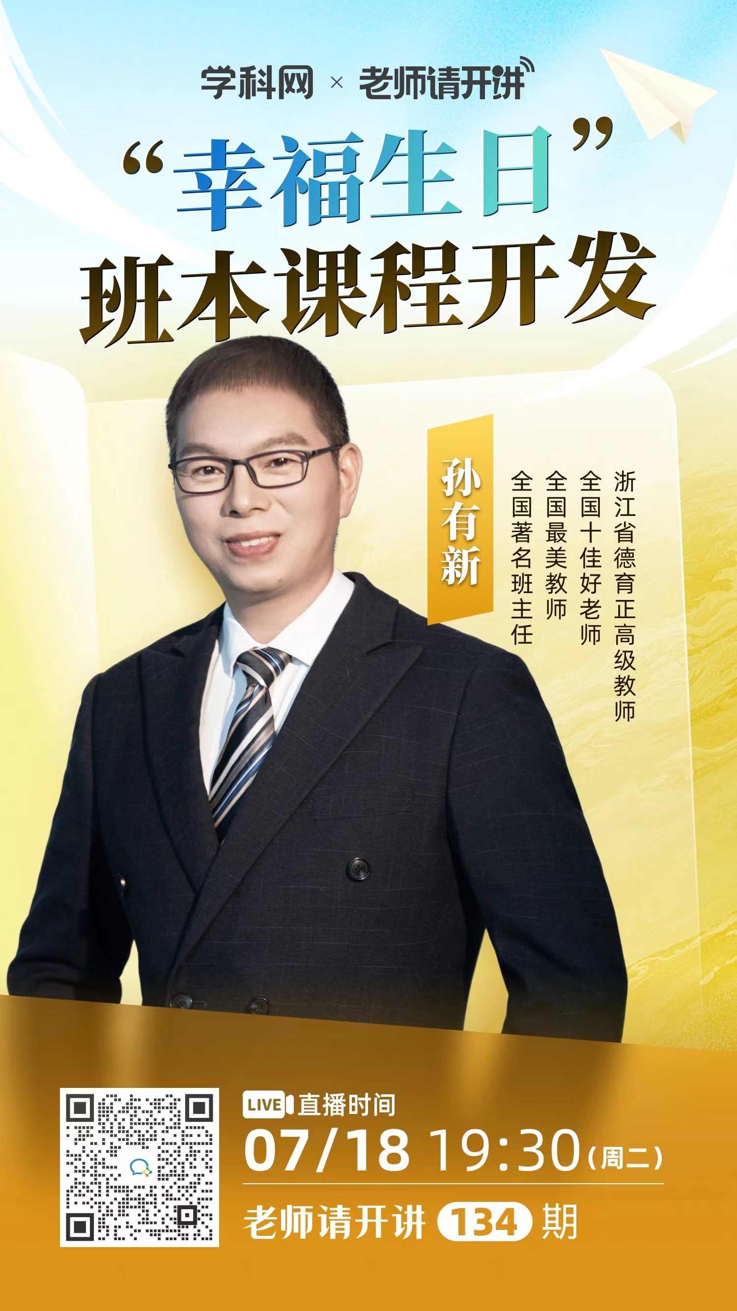 2023年7月18日,为了引导学员创新带班方略,做幸福全能的班主任,温州市孙有新“名师送教”工作室联合永嘉县罗浮中学、浙江省孙有新网络名师工作室、瑞安市钱文辉名班主任工作室、安阳实验中学——高楼镇中学“教共体”德育团队、龙泉市练芬玲德育名师工作室、龙泉市小学班主任工作室、新昌县王剑平名班主任工作、丽水二中心晴心理工作室举行第27次研修活动。在这次活动中,温州市孙有新“名师送教”工作室主持人孙有新老师受邀参加学科网“老师请开讲”栏目7月班主任成长专场,面向全网作主题为《“幸福生日”班本课程开发》的讲座。