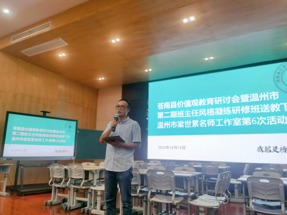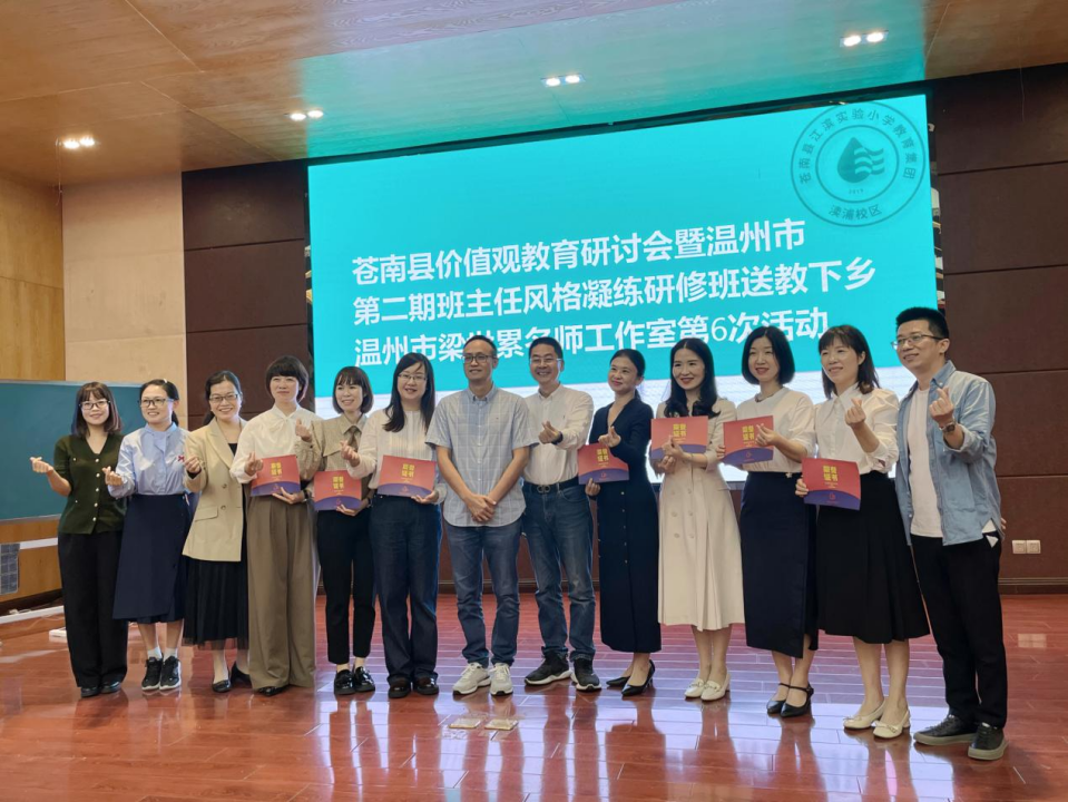 秋日艳阳暖朗中。为落实教育部《中小学德育工作指南》、《温州市新时代中小学价值观教育实施意见》文件精神,引领班主任风格凝练。温州市第二期名班主任风格凝练班学员、温州市梁世累名班主任工作室名学员、苍南县各名班主任工作室学员齐聚苍南县江滨实验小学教育集团渎浦校区举行班主任凝练研修活动。