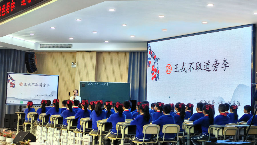 早上第二节课是由温州市教坛新秀、龙港市第一小学李爱粉老师带来的同课异构《王戎不取道旁李》。课堂伊始,李老师播放一段“竹林七贤”微视频让学生快速认识王戎,通过识课题、读内容、抓节奏、借人物、明意思五个步骤疏通古文,想王戎心中所想,思王戎心中所思,辨王戎心中所辨。学生在学习课文时也培养了独立思考的习惯。李老师的课堂充满趣味,学生意犹未尽。