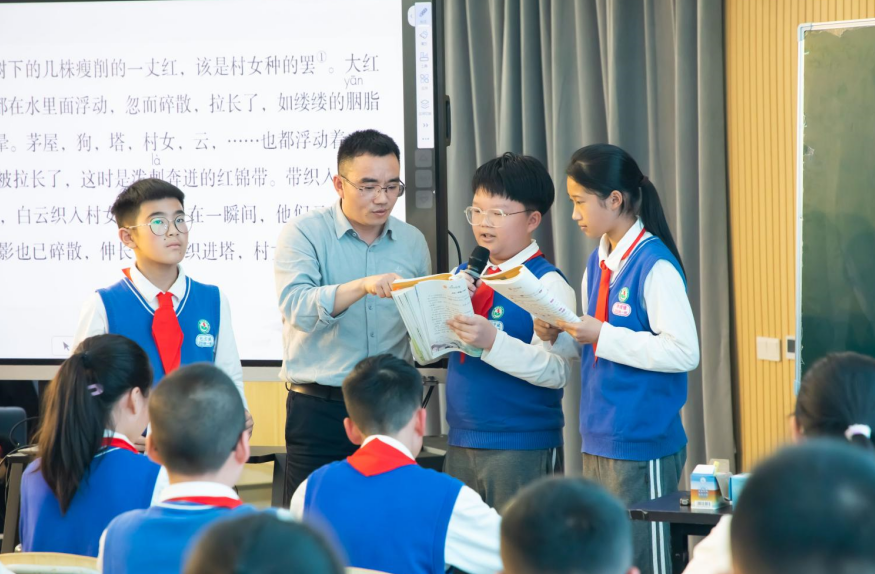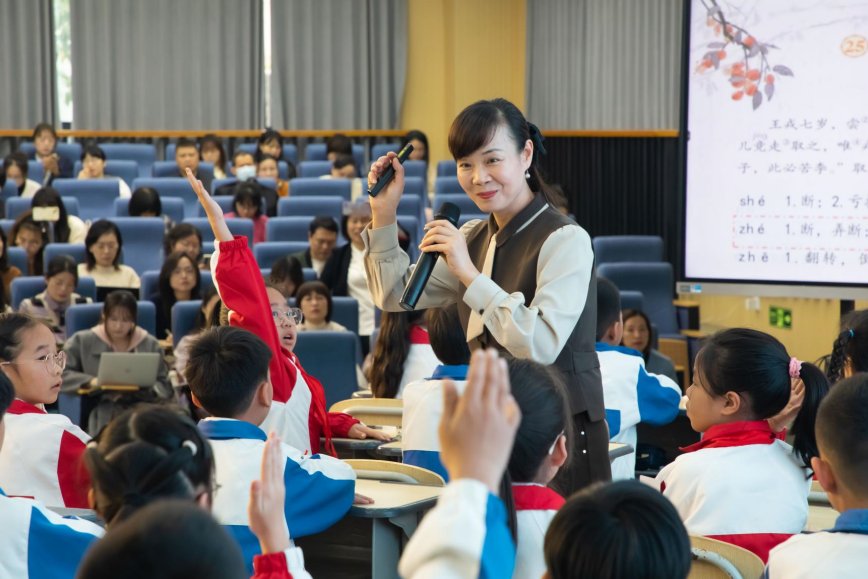 早上第一节课是平阳县教坛新秀、鳌江实验小学陈姜维老师带来的课例《王戎不取道旁李》。陈老师以学校“瓯窑馆”社团的陶艺作品导入,创设寻找“中国历史俊杰人物”情境,带同学们和王戎进行一场思辨之旅。课堂上,陈老师引导学生通过自划停顿、配乐朗读,读出古文的韵味;通过王戎和诸小儿的行为对比,挖掘王戎“不动”后的观察与思考;最后以“陶艺吧”讲解员评比,让学生把故事说生动。陈老师的语言温柔似暖阳,学生在轻松融洽的氛围中学有所得。
