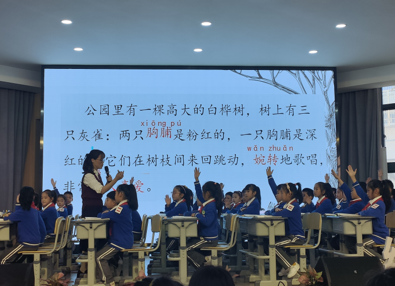 下午第一节课由温州市教坛中坚、瓯海区第二实验小学张克老师执教《灰雀》。课堂伊始,张老师带着孩子们化身小侦探,初步感受从观察到推理的过程,充分激发学习兴趣。课前收集疑问并整合,课中回顾旧知,教授新法,孩子们在张老师的引导下探寻"灰雀是什么样子的”、“课文围绕灰雀写了一个什么故事”这两个主要问题。最精彩的便是“疑点大发现”环节,一个个小侦探从文本中关注细节,发现疑点,不断推理。张老师的课堂让孩子们的思维碰撞出无限的精彩。