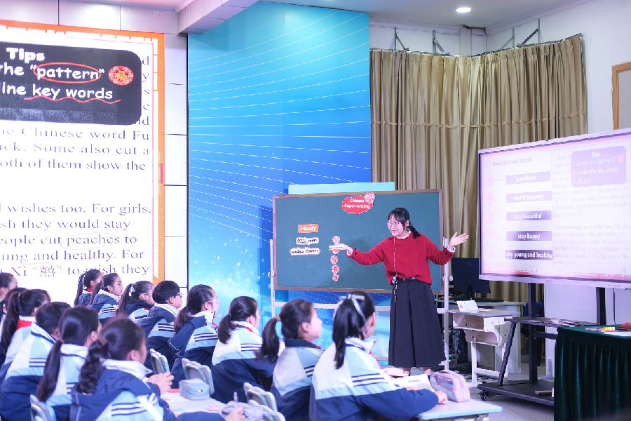 上午第二堂课是龙港市科技小学陈杨凡老师带来的Chinese Paper-cutting。王老师通过学生们的新西兰朋友发送的邮件导入本课,通过问题链“What’s the most important festival in China?”“How do we celebrate the Spring Festival?”引入本课主题Chinese paper-cutting,在创设去剪纸博物馆参观的场景,通过博物馆语音介绍、阅读导览小册子,完成听、说、读、写活动,学生在讨论剪纸蕴含的意义和自己实践剪纸并介绍的过程中,在深入了解中华传统文化的同时也学习了如何用英语表达传统文化。
