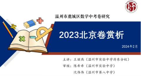 下午2:00来自温州实验中学的王丽燕老师作《2023年北京中考卷赏析》 。王老师分别从试卷结构、试卷特色、对比温州三个方面加以阐述。2023年北京中考卷的试卷结构从题型分析、细目表两个方面归纳特点。接着王老师阐述北京中考卷的几大特点:①:将“五育”有机融入试卷素材,体现数学学科育人导向;②面向全体,以学定考,回归课堂,回归教材;③素养立意,思维引领,导向教学。最后,王老师对比温州卷发现:相同知识点考察形式不同,比如温州卷将解一元一次不等式组放在填空题,而北京卷将解一元一次不等式组放在解答题,给予较大分值。比如同样考查圆的试题,北京卷本题主要考查了垂径定理,等腰直角三角形的判定和性质,切线的性质,解题的关键是熟练掌握垂径定理。而温州卷本题考查了圆的轴对称性,平行线分线段成比例,解直角三角形,勾股定理,七巧板等等。