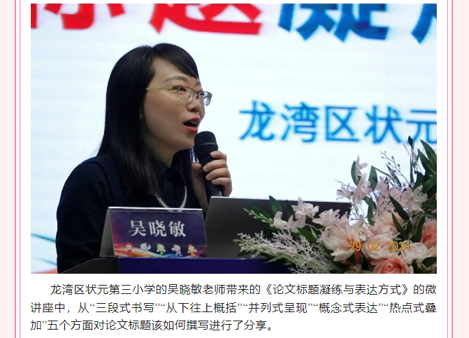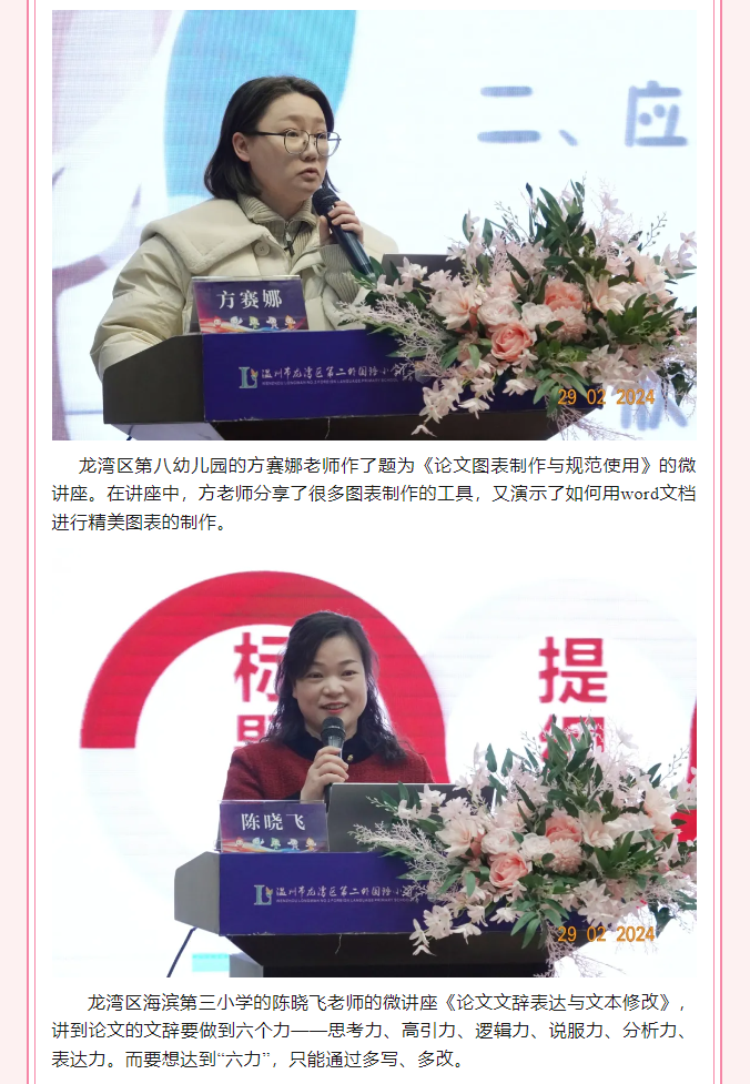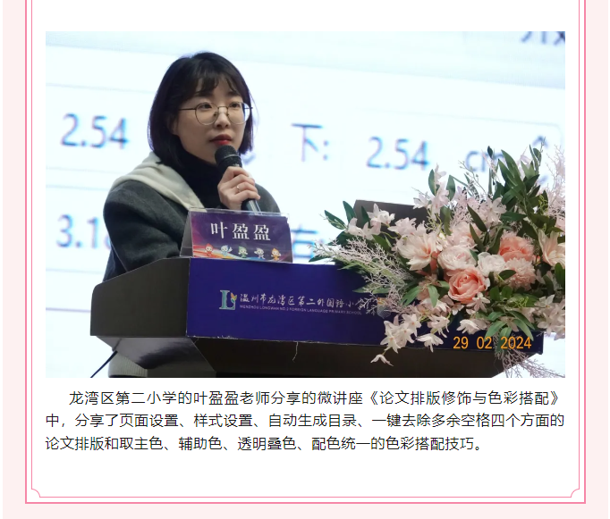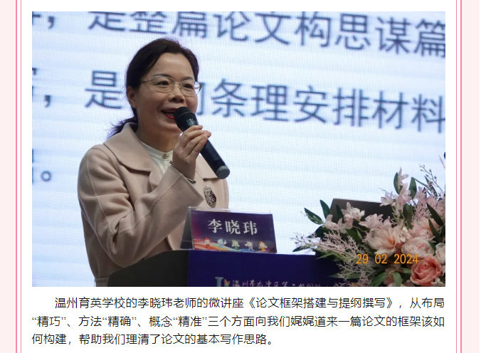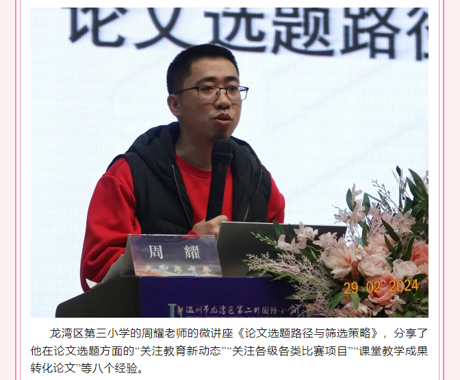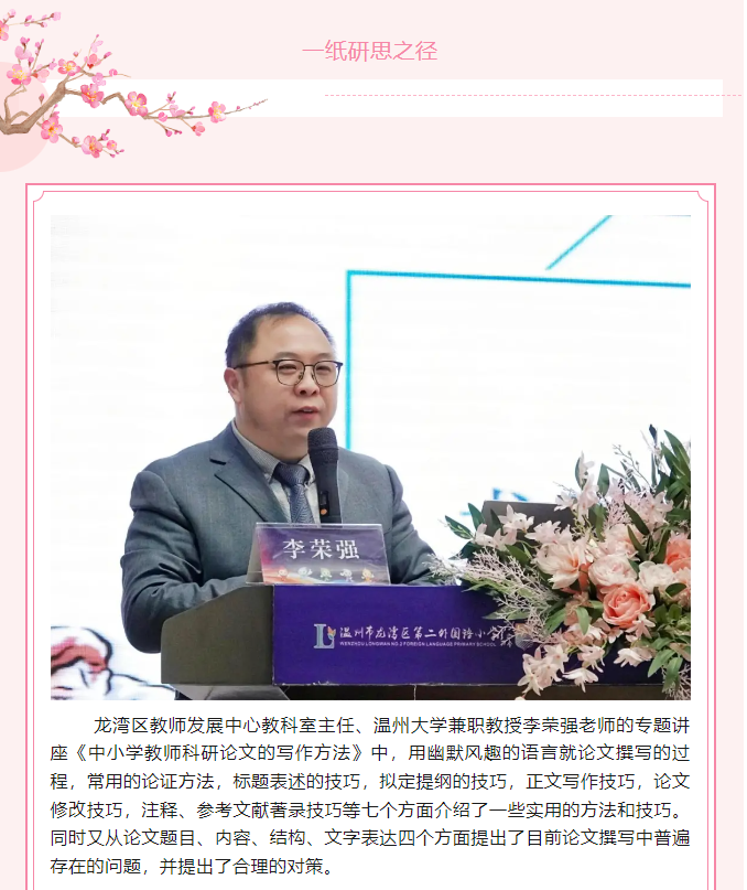为进一步加强工作室成员的教育科学研究水平,提升教科研能力,2024年2月29日,工作室成员参加了在龙湾区第二外国语小学举办的龙湾·洞头教育科研论文写作活动。此次活动分为三个部分,首先是叶海燕老师带来教学展示,接着是九位老师的微型讲座,最后是龙湾区教师发展中心的李荣强老师的专题讲座。