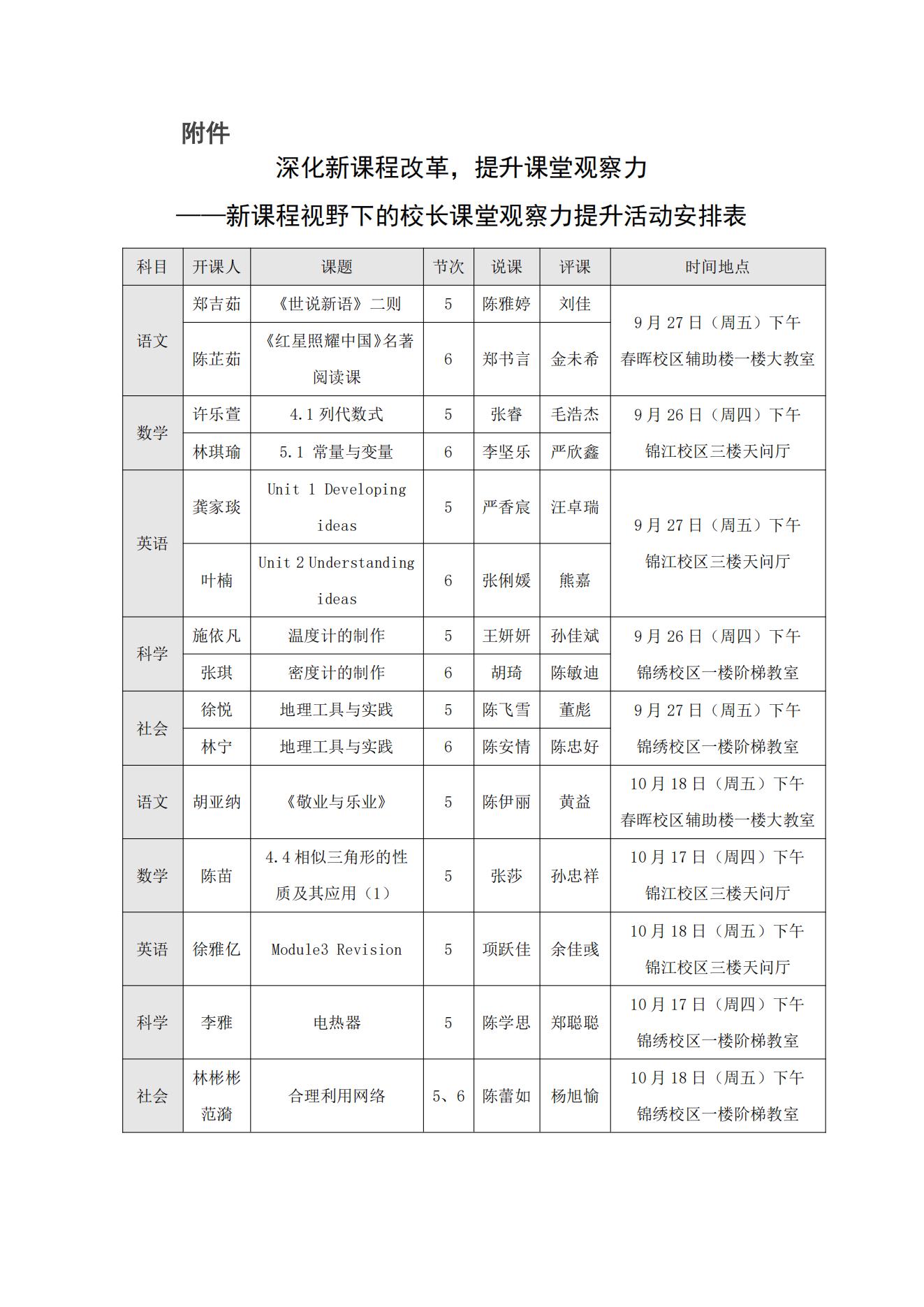 深化新课程改革,提升课堂观察力 ——新课程视野下的校长课堂观察力提升活动安排表