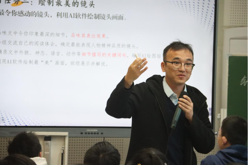 上午第一节课由温州榕园学校王汉雷老师执教《美丽的颜色》。课堂环节以“AI制作居里夫人人物展板”为主任务,开创技术赋能语文教学新范式。课程通过"镜头语言概括关键事件"和"AI指令迭代优化"双任务驱动,引导学生在文本细读与智能技术间建立深度关联。