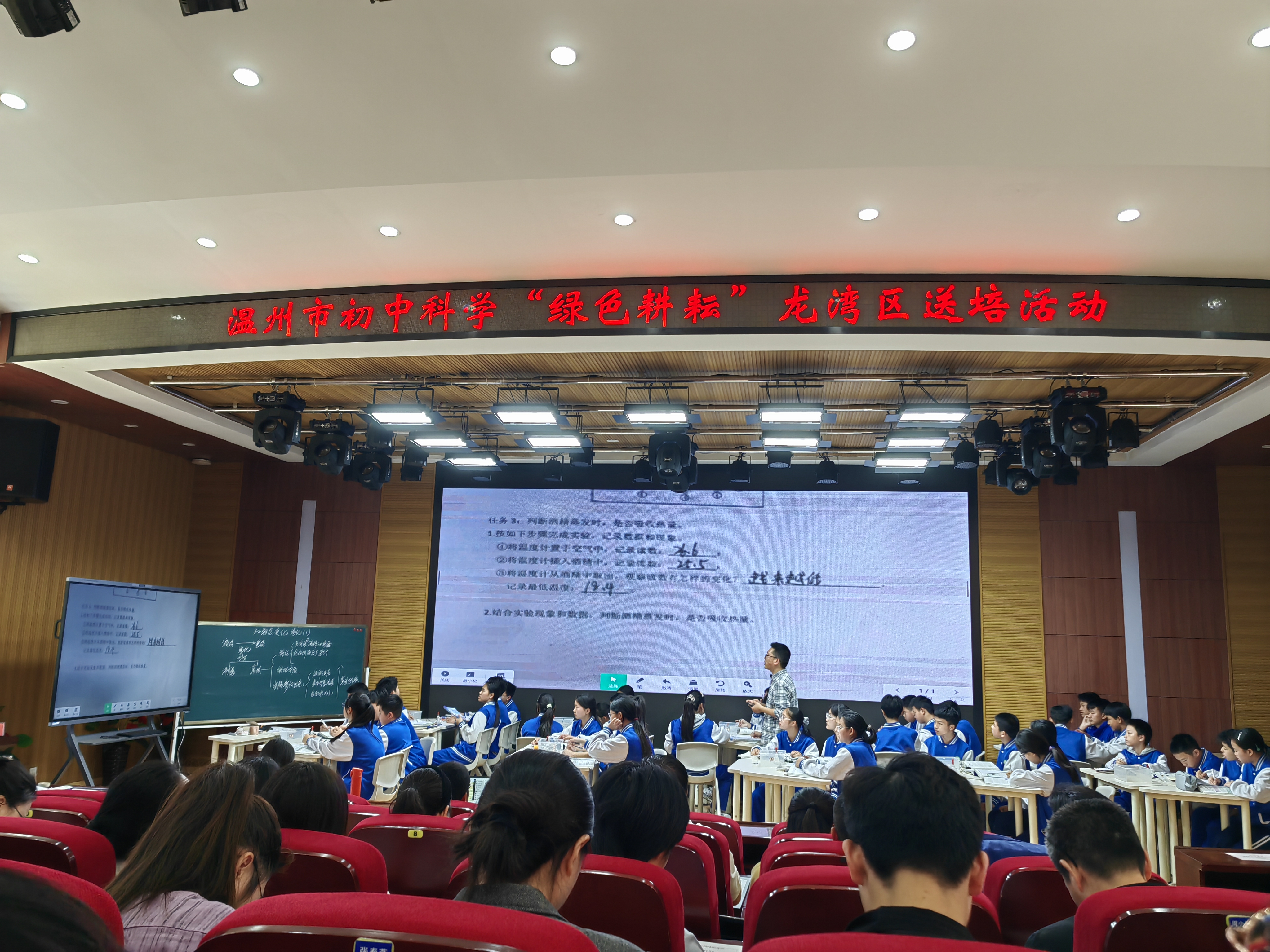 活动伊始,工作室成员观摩了两节高质量课堂展示。温州外国语学校李丕荣老师以《汽化》为主题,让学生自主建构模型,通过证据进行推理。结合工程学习汽化相关知识。展现了知识迁移能力的培养路径。