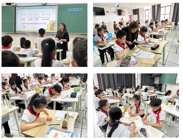 上午第一节课由苏梦雅老师和四年级的孩子们带来《四边形内角和》。苏老师带领孩子回顾三角形的内角和唤醒学生的记忆,引出四边形的内角和。观察长方形、正方形的内角和思考梯形、平行四边形的内角和,提出猜想“所有的四边形内角和都是360度”。学生通过自主探究、合作交流,运用多种不同方法来探究四边形的内角和,让学生感受转化思想解决问题的过程,经历“猜想—验证—结论”的探究全过程。并以此为基础,探究五边形、六边形、七边形的内角和,发现多边形的边数与分割成的三角形个数之间存在关系,拓展N边形的内角和。