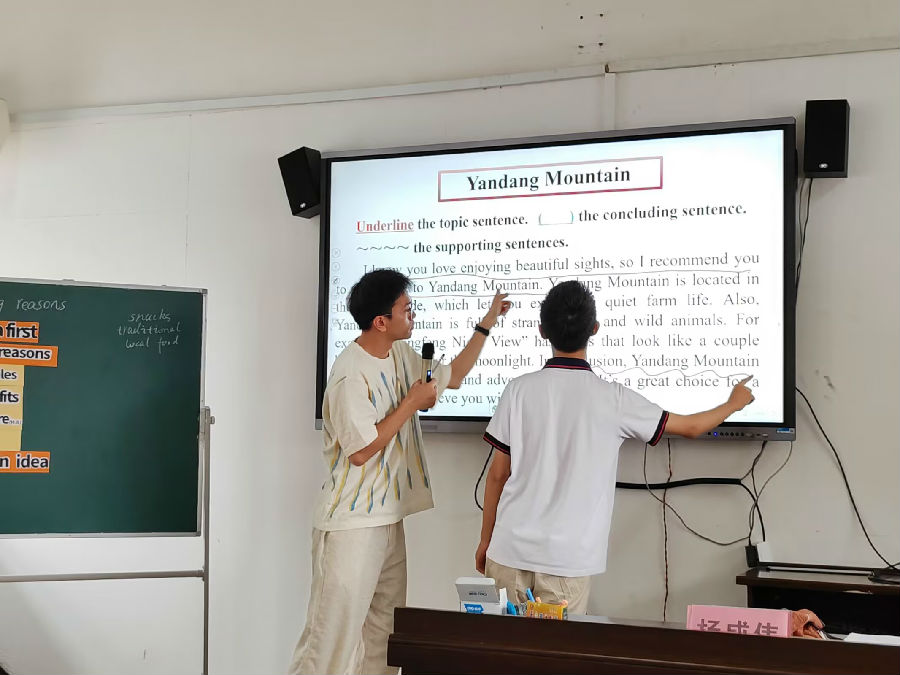 瓯海区梧田第一中学的杨老师的写作课堂则奏响理性与创意的交响乐。围绕“How to give strong reasons”这一核心,他以“推荐平阳旅游地”为情境,带领学生穿梭于Give examples, show benefits, explain feature以及compare的多维空间。当“GPS写作法则”(Give your ideas first- Present strong reasons-Summarize the main idea)跃然黑板时,原本零散的写作思路瞬间变得脉络清晰。杨老师则以思维导图逐步搭建写作框架,附以好词好句让框架鲜活起来,让抽象的逻辑可视化起来。最令人难忘的是杨老师以浙江中考题为终,让学生在选择proper school中迸发思维火花,将理论转化为鲜活的语言实践。让在场的老师不禁感叹:原来复习课可以既有方法论的沉淀,又有思维力的激荡,这样的课堂正是我们冲刺的备考指南。