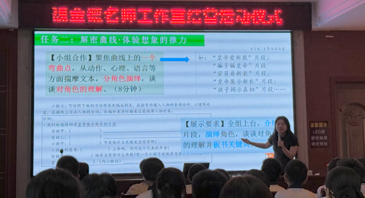 温州市实验中学朱怡老师的《皇帝的新装》课堂则另辟蹊径。她以学生课前绘制的 “情节曲线图” 为切入点,快速锁定文章核心关键词。随后聚焦曲线 “弯曲点” 这一创新视角,让学生从动作、心理维度揣摩文本,并通过分角色演绎深化对人物形象的理解。课堂尾声,“安徒生童话是一面什么样的镜子” 的追问,将童话解读引向对人性与社会的深刻思考,实现工具性与人文性的统一。